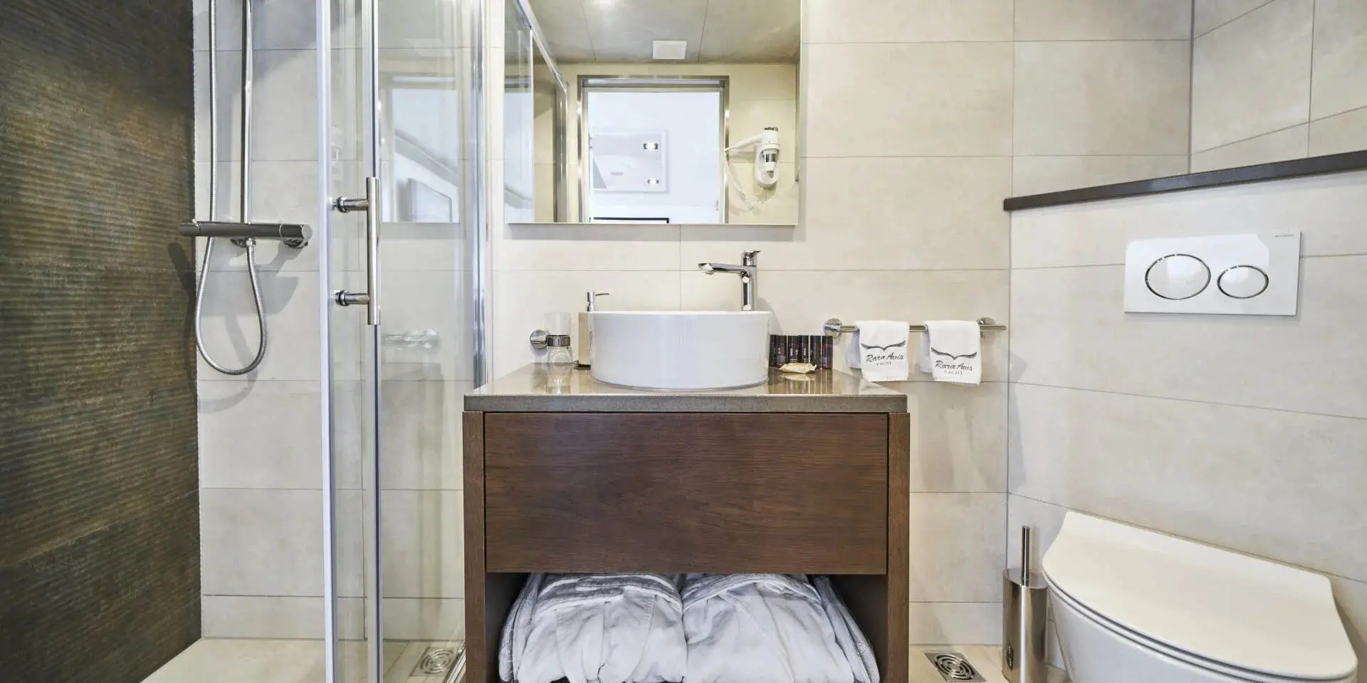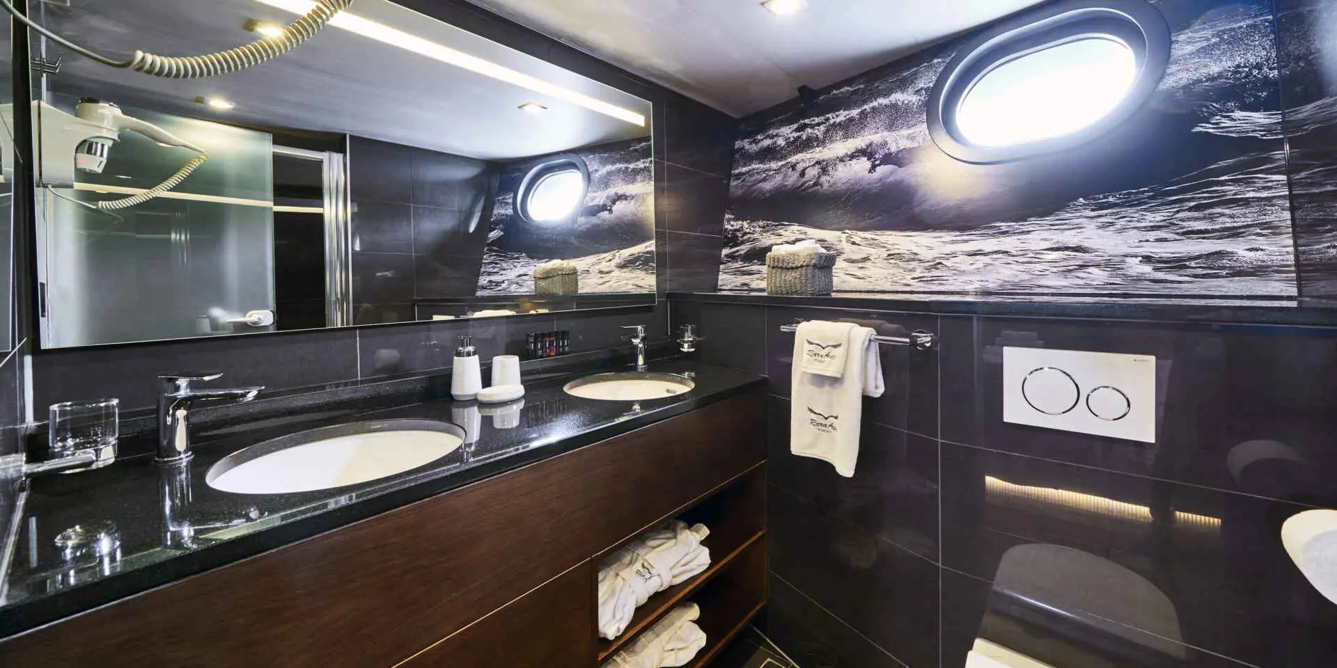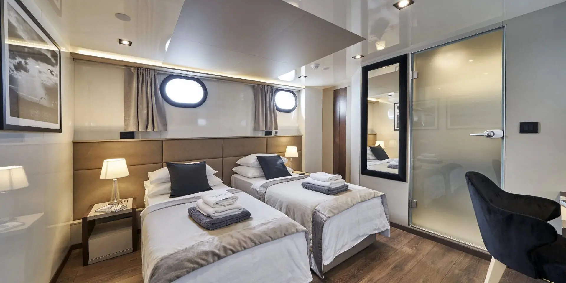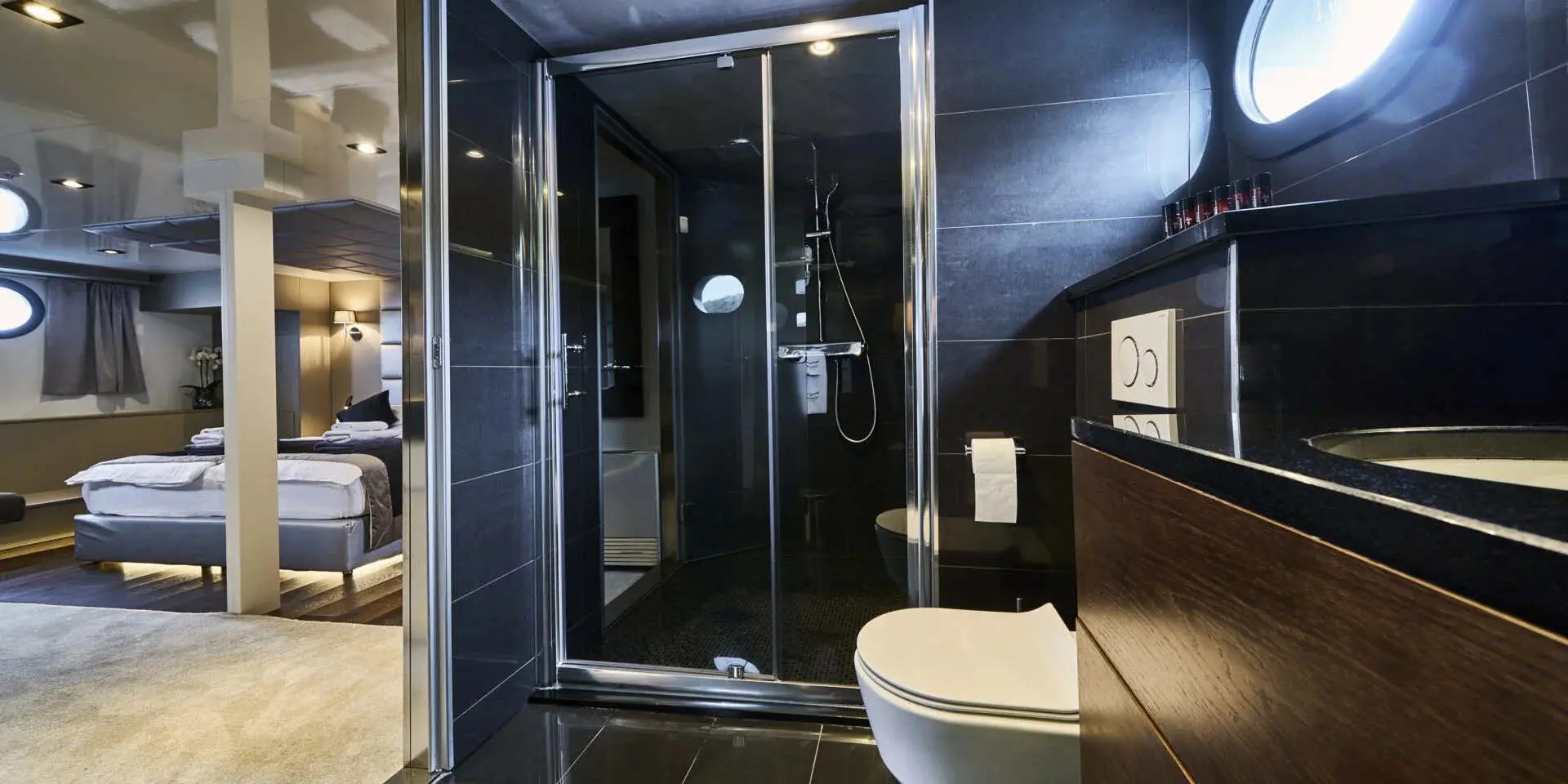 The Master Suite and VIP Cabin are generously spacious, each offering plush bedding, ample storage, and en-suite bathrooms with refined finishes. Large windows flood the rooms with natural light and offer stunning sea views. There are two double cabins and two twin cabins—perfect for couples or families. Every area of Rara Avis is thoughtfully designed to elevate your onboard experience.