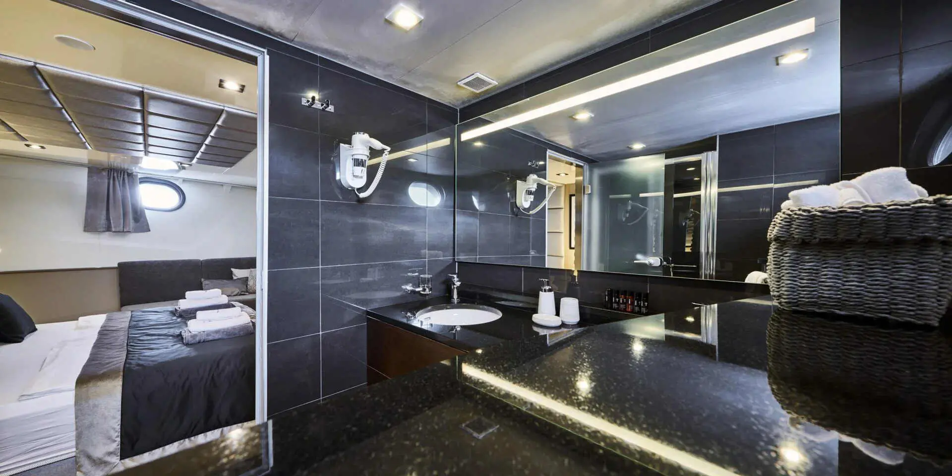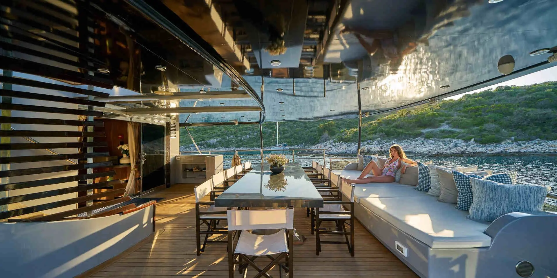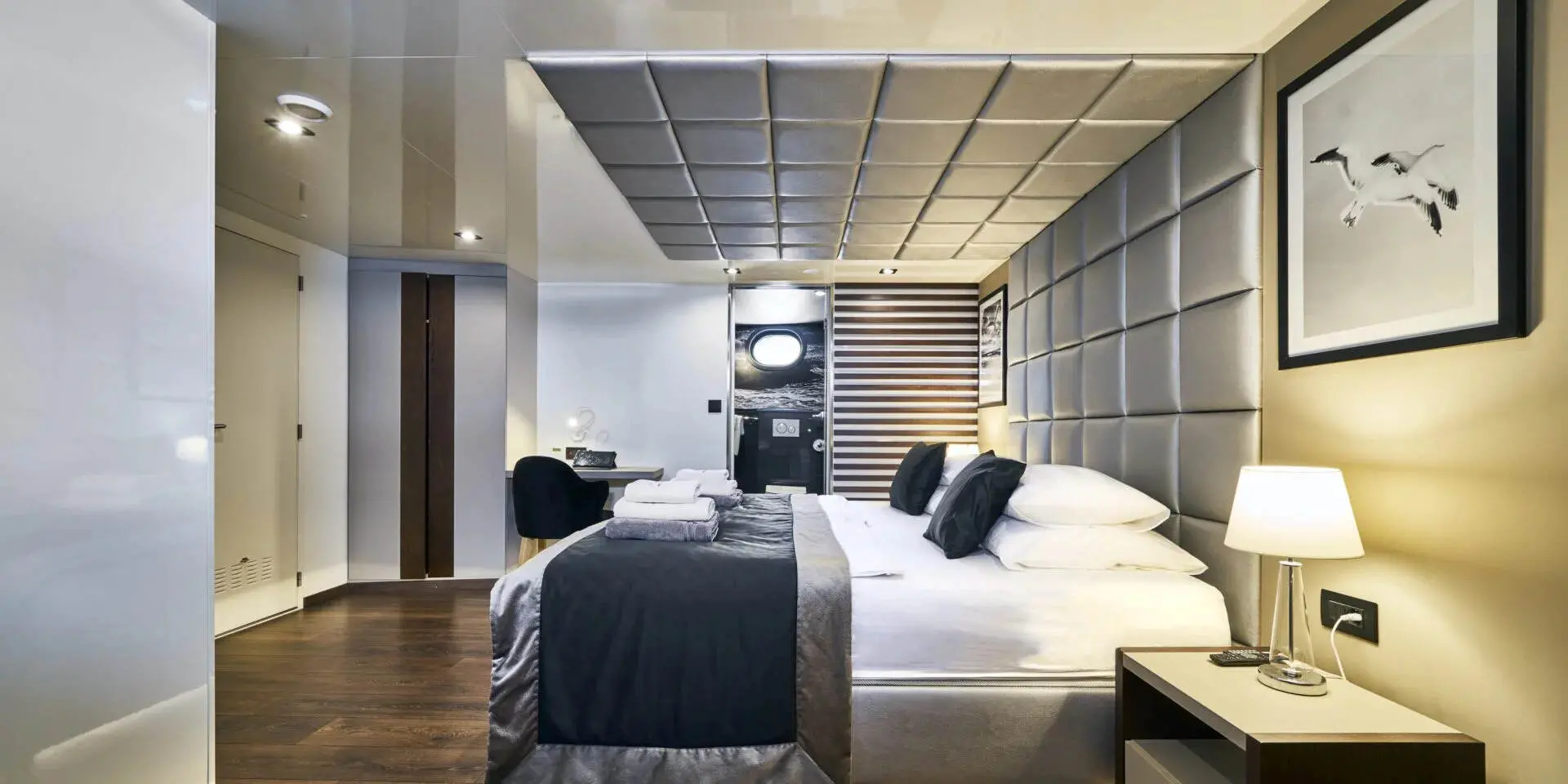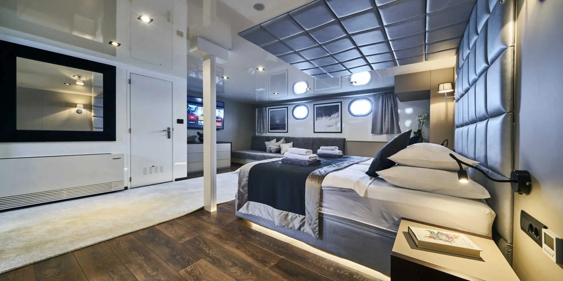 The Master Suite and VIP Cabin are generously spacious, each offering plush bedding, ample storage, and en-suite bathrooms with refined finishes. Large windows flood the rooms with natural light and offer stunning sea views. There are two double cabins and two twin cabins—perfect for couples or families. Every area of Rara Avis is thoughtfully designed to elevate your onboard experience.