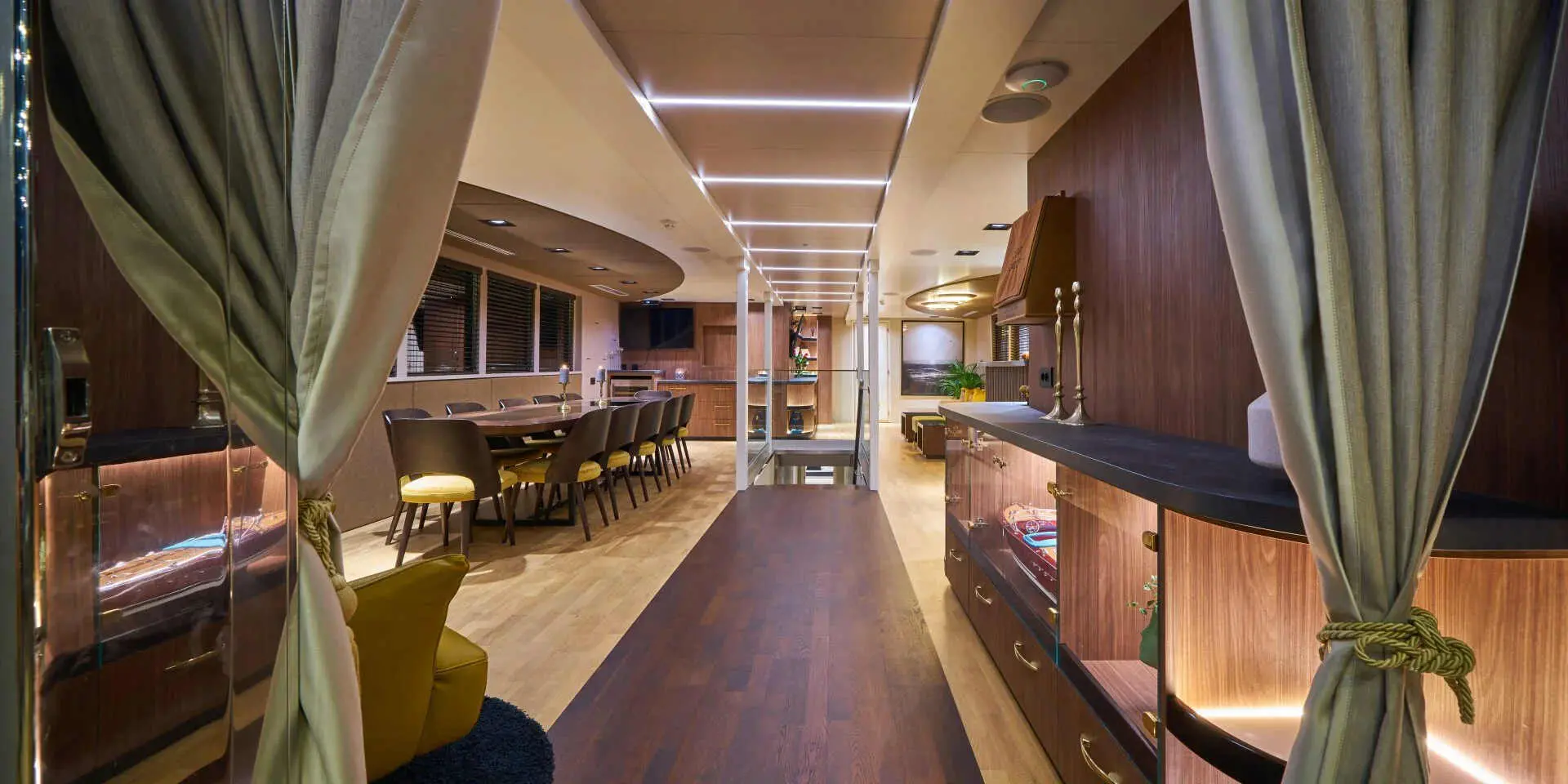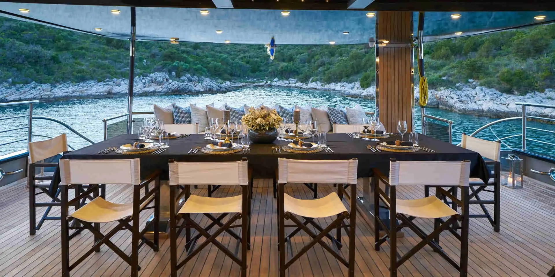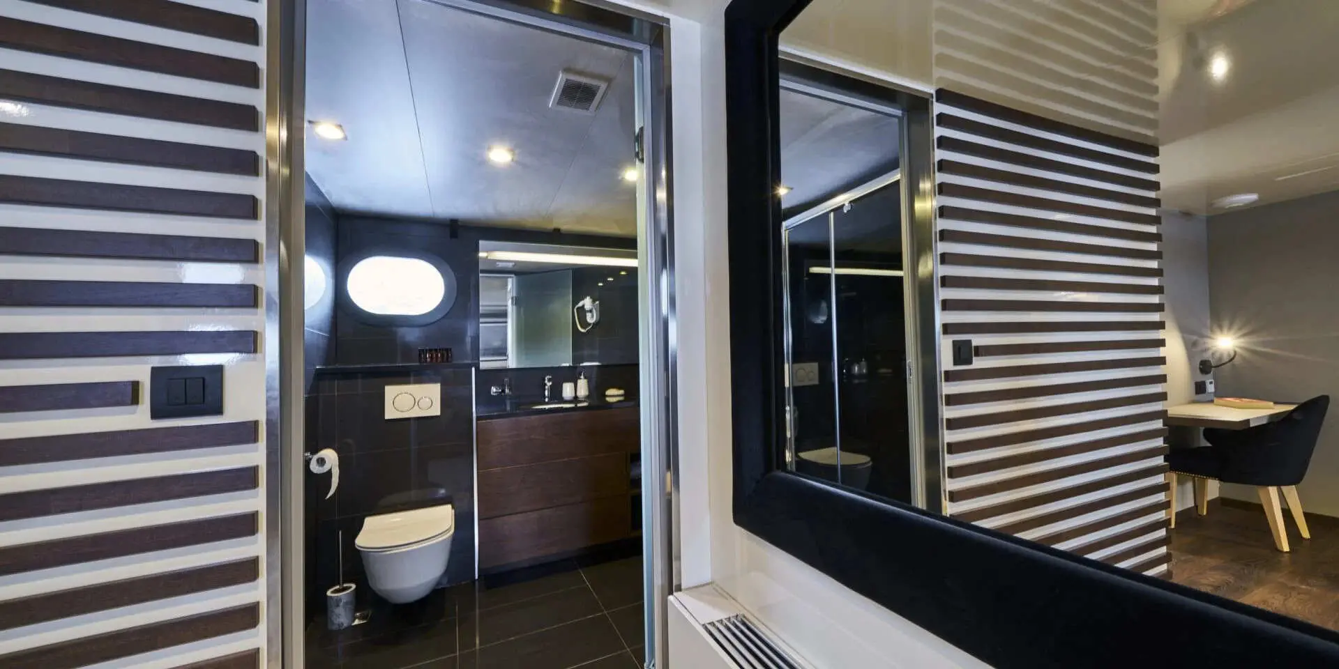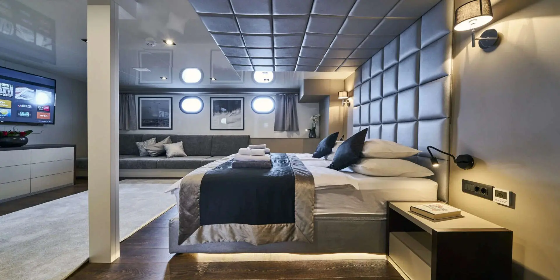 The Master Suite and VIP Cabin are generously spacious, each offering plush bedding, ample storage, and en-suite bathrooms with refined finishes. Large windows flood the rooms with natural light and offer stunning sea views. There are two double cabins and two twin cabins—perfect for couples or families. Every area of Rara Avis is thoughtfully designed to elevate your onboard experience.