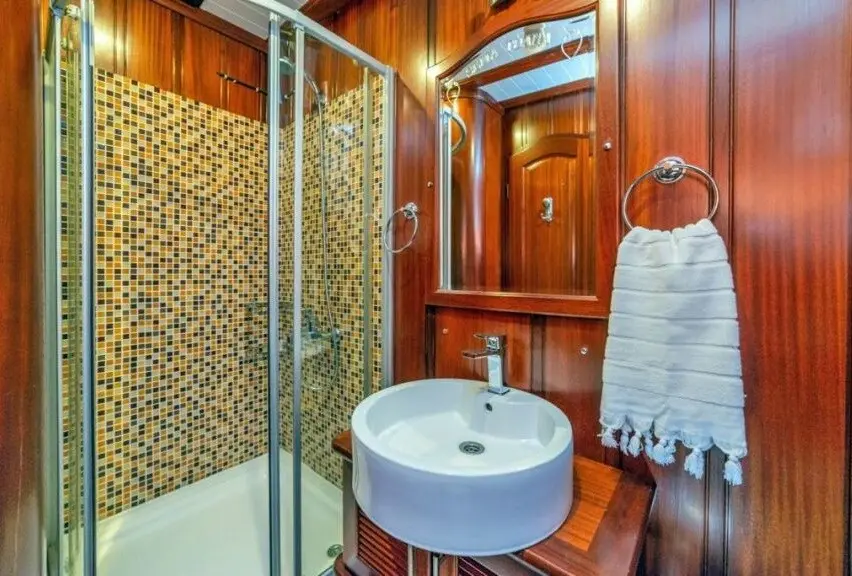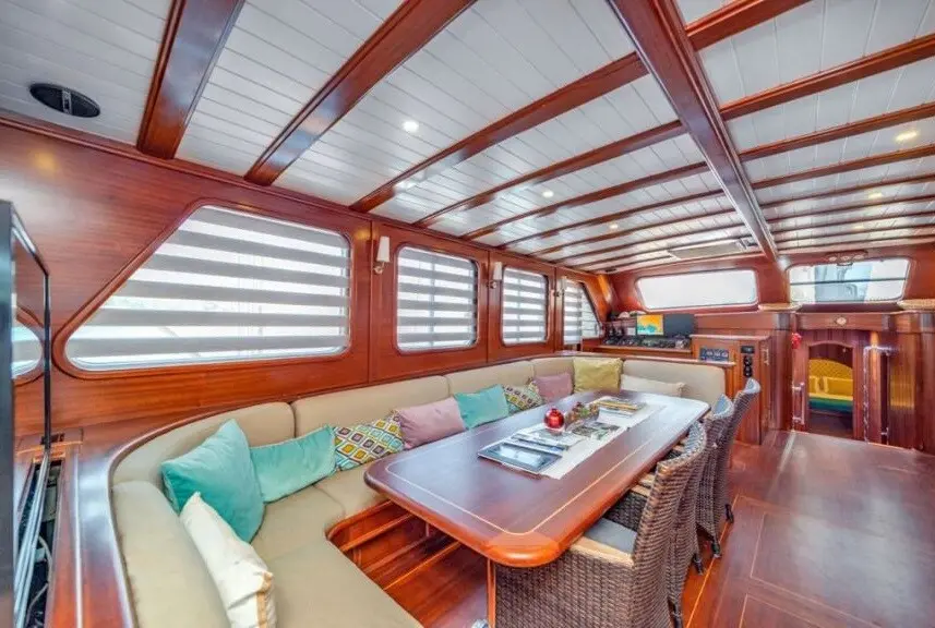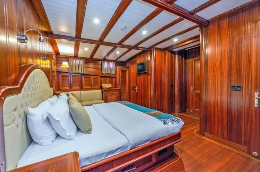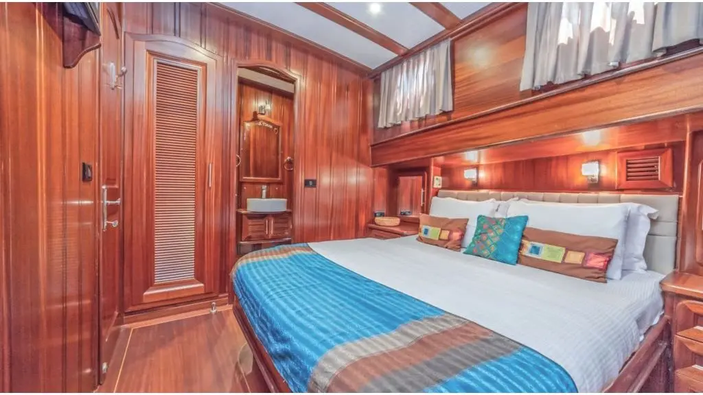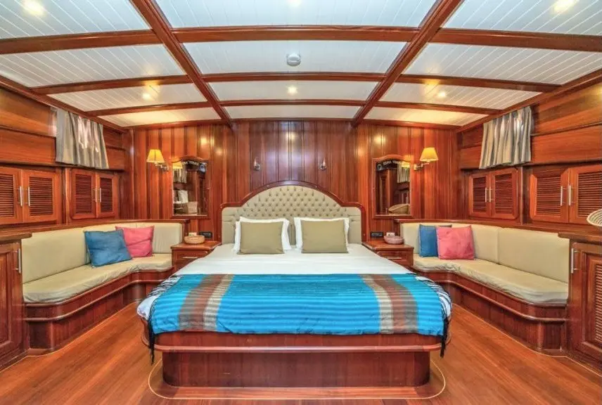 Sema Tuana’s accommodations include two master cabins, two double cabins, and two twin cabins, each equipped with air conditioning, en-suite bathrooms, and electric toilets, ensuring privacy and comfort for all guests. The gulet’s elegantly appointed public areas, including an indoor restaurant and various lounges, provide perfect settings for relaxation and socialization against the backdrop of the sea.