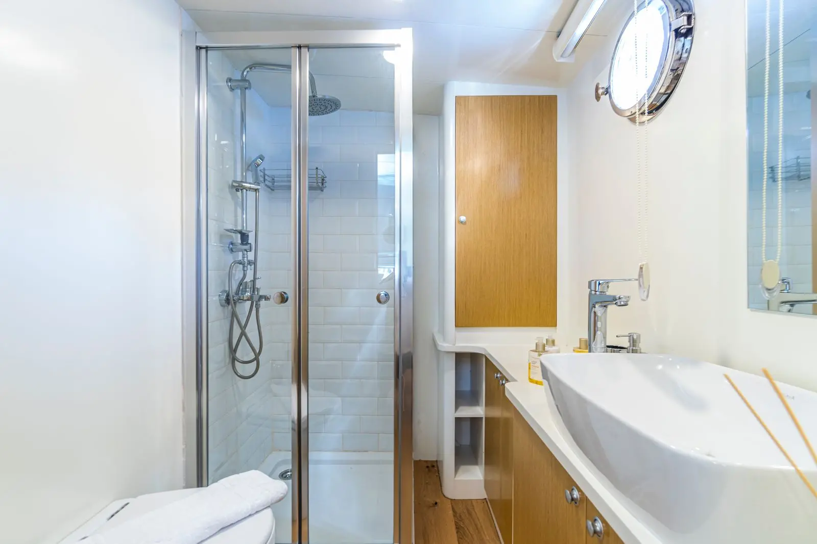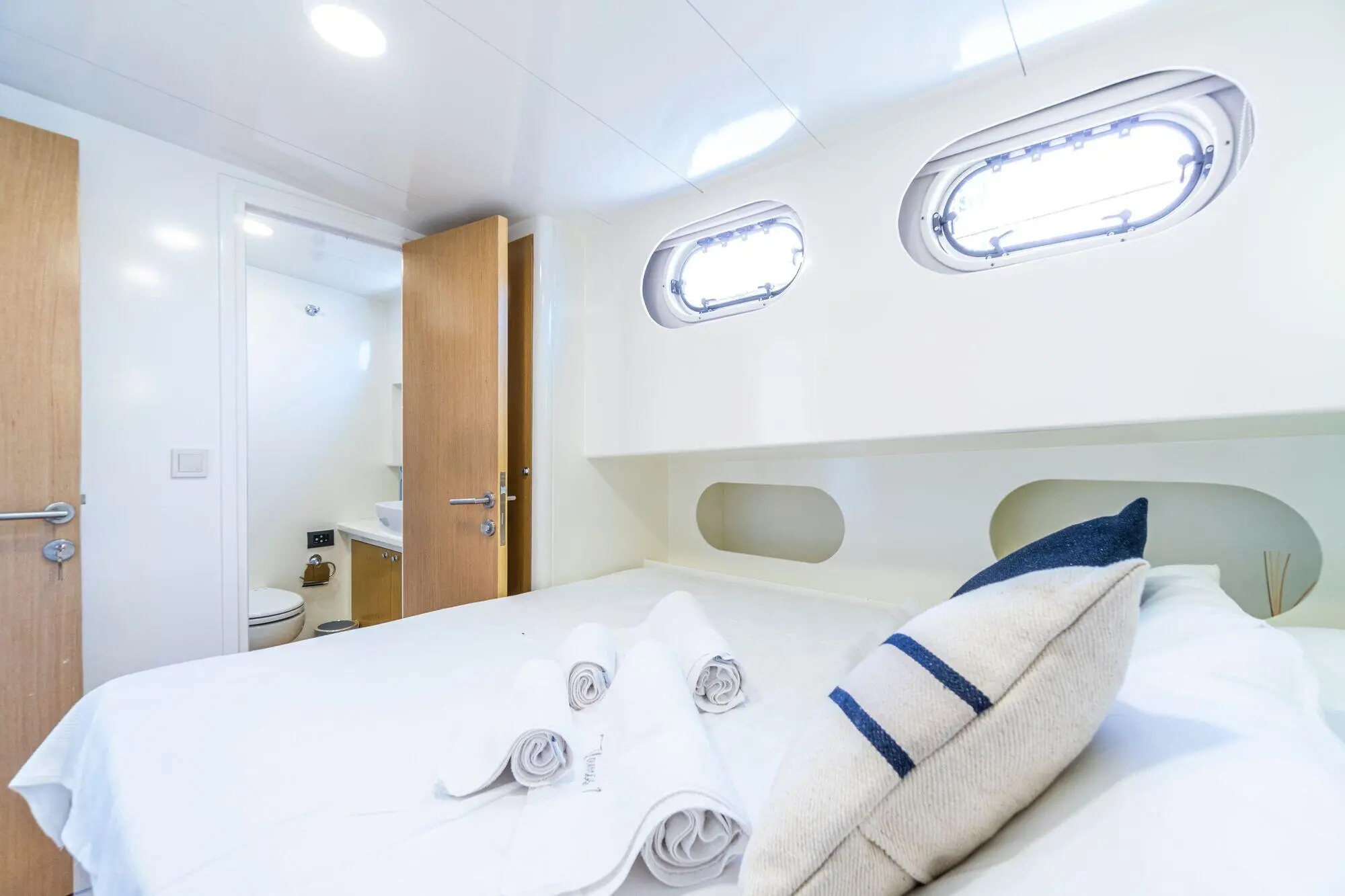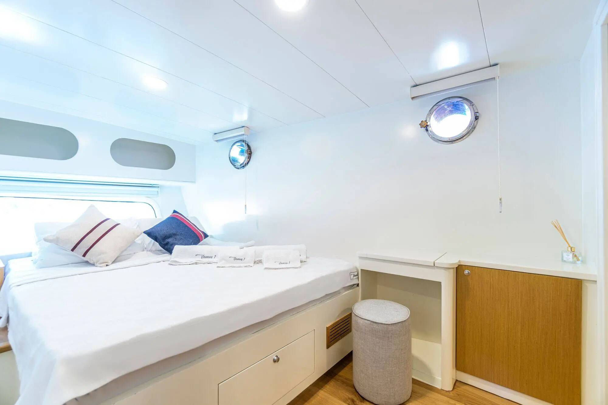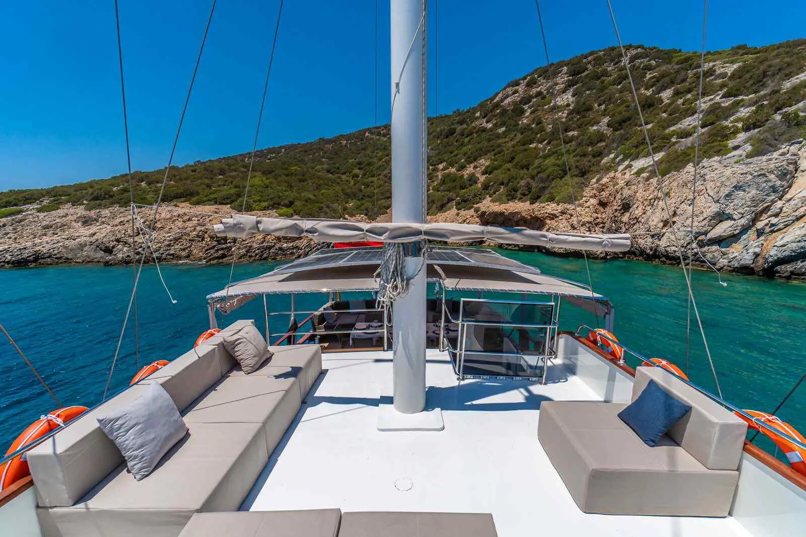 Vamos I offers a range of amenities designed to enhance the guest experience, from an indoor restaurant and entertainment systems to water sports equipment, ensuring comfort, entertainment, and adventure. Vamos I's cabins are designed with comfort and convenience in mind, providing a cozy retreat after a day of sailing and exploring. The two master cabins offer spacious and luxurious accommodations, featuring large beds, ample storage, and en-suite bathrooms with modern fixtures. These cabins provide the ultimate comfort for guests seeking a premium experience. The four double cabins are well-appointed, offering comfortable double beds and en-suite bathrooms. These cabins are perfect for couples or friends traveling together. All bathrooms on Vamos I are equipped with shower boxes and home-type toilettes, providing the comforts of home in a traditional setting.
