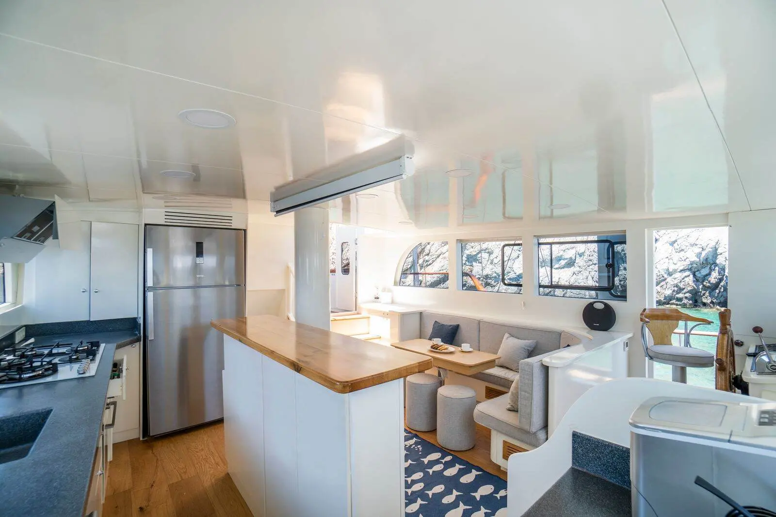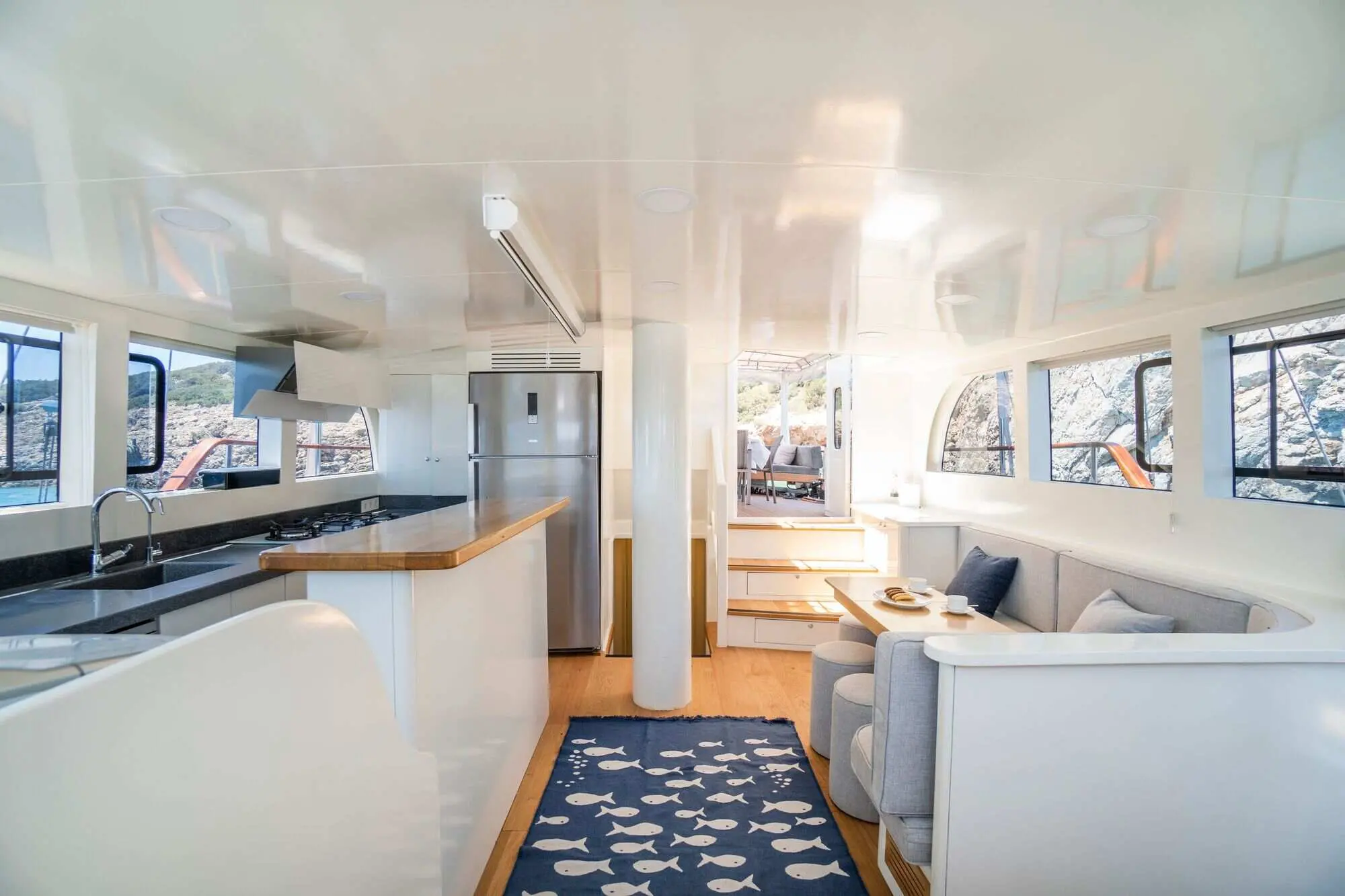 Each cabin offers a private retreat, allowing guests to enjoy their vacation in peace and comfort. Dining on Vamos I is a highlight of the sailing experience. The gulet's indoor restaurant provides a stylish and comfortable dining environment, with large windows offering stunning views of the sea.