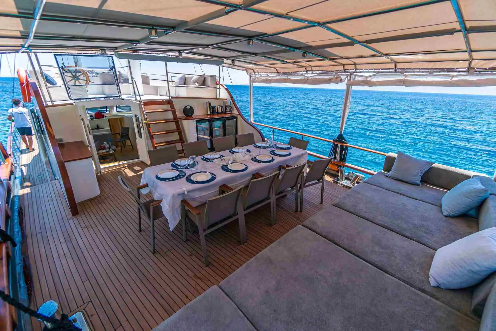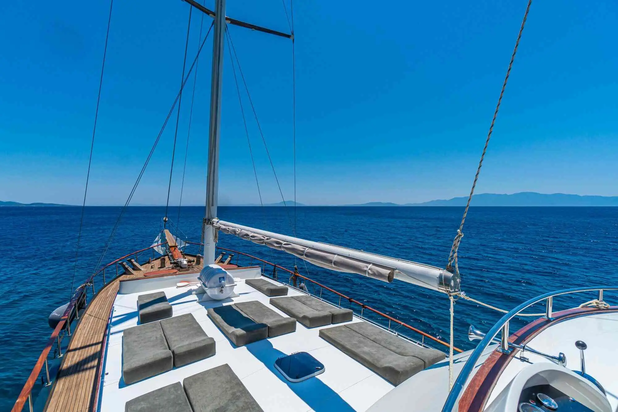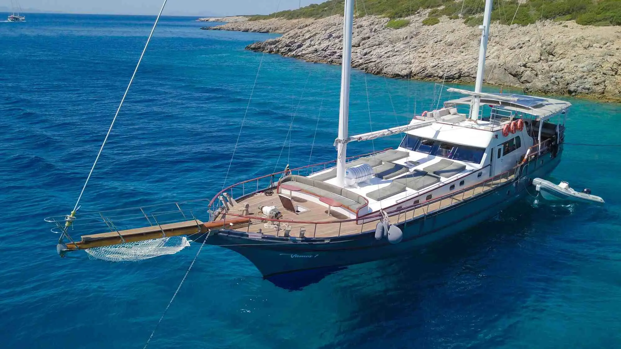 Understanding the specifications of Vamos I highlights its capabilities and the comfort it offers. Powered by a 360 hp CAT engine, Vamos I cruises at a comfortable speed of 11 knots. The gulet is equipped with a 27 kW Onan generator, ensuring a reliable power supply for all onboard amenities. With a fuel capacity of 3,000 liters and a fresh water tank of 9,000 liters, Vamos I is well-prepared for extended sailing adventures.