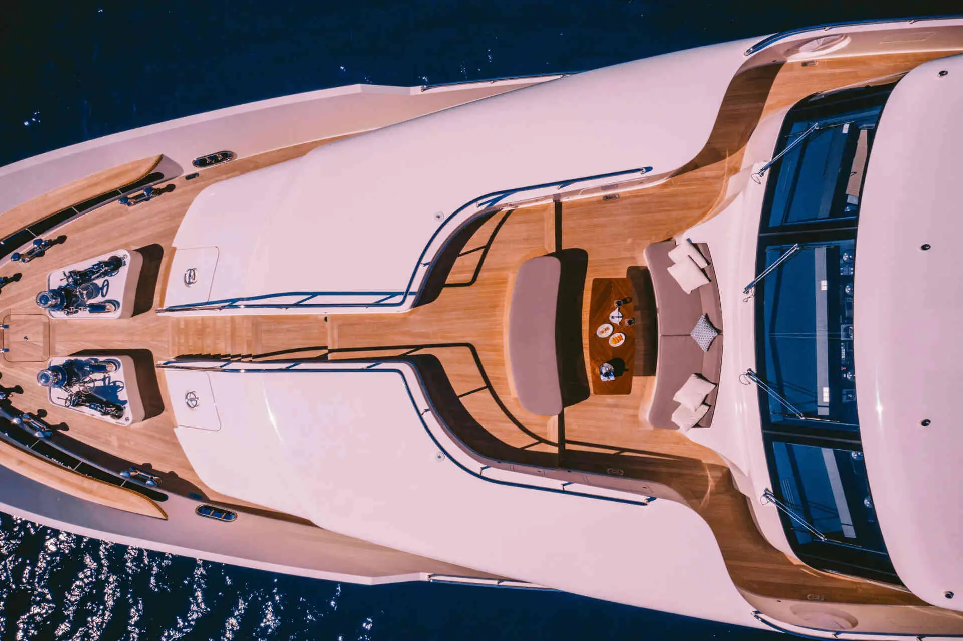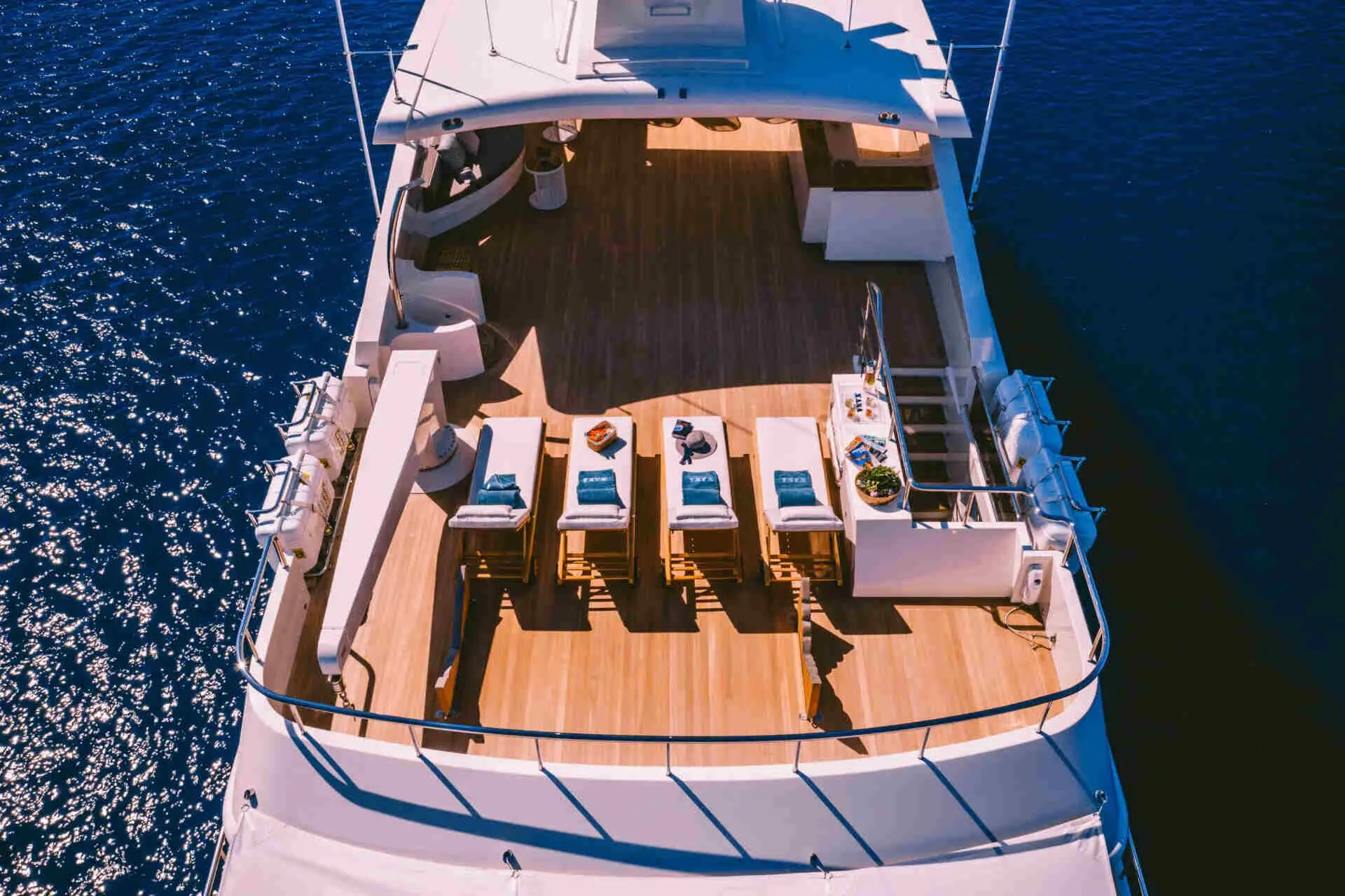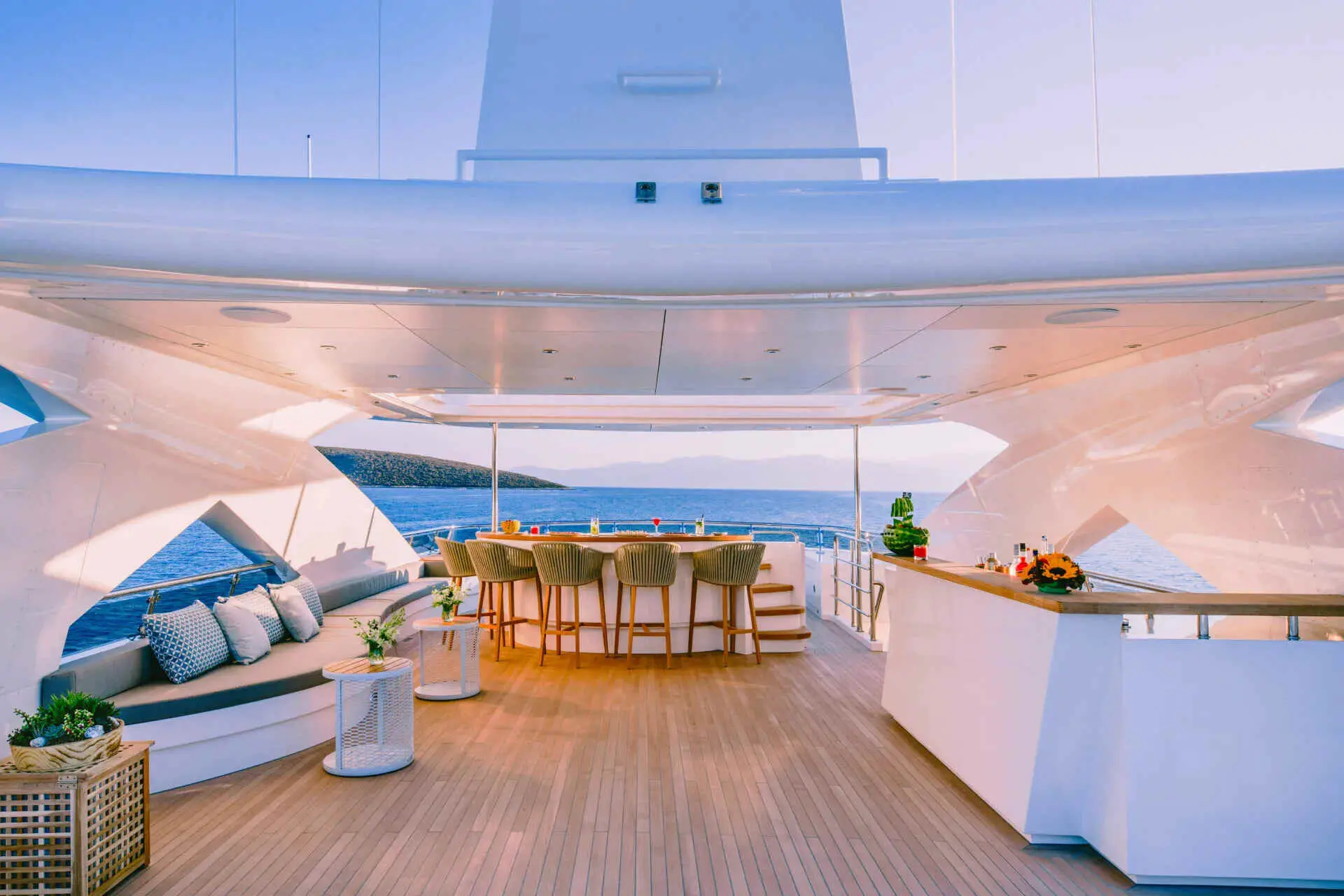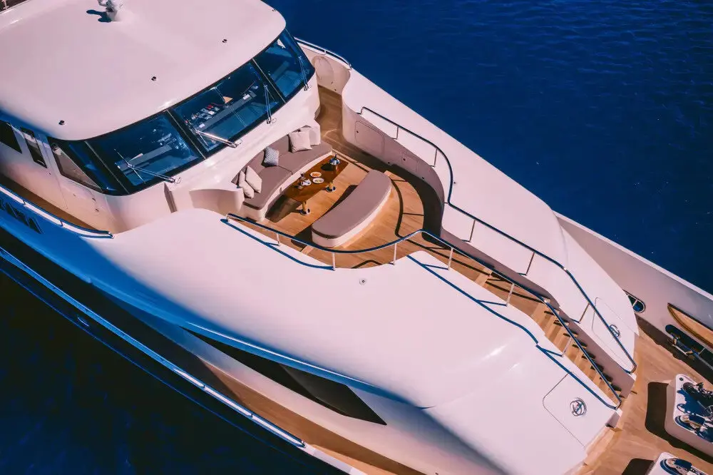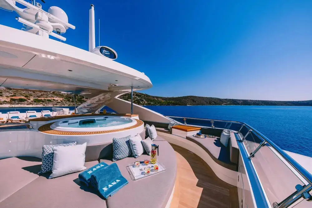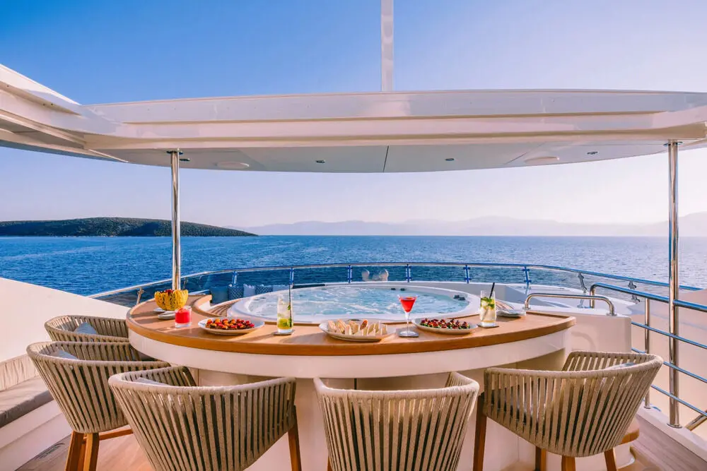 Now for the fun part. The deck Jacuzzi adds a resort-style touch, creating an inviting place to unwind with sea views all around. Meanwhile, the swimming platform makes access to the water easier and more enjoyable. Whether guests are going for a morning dip, launching a Seabob session, or simply dangling their feet in the sea at sunset, this area often becomes a favorite social spot.