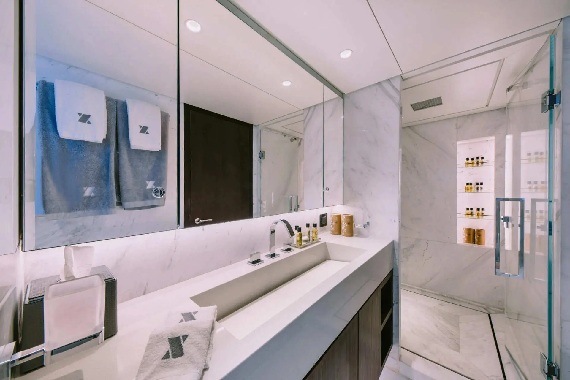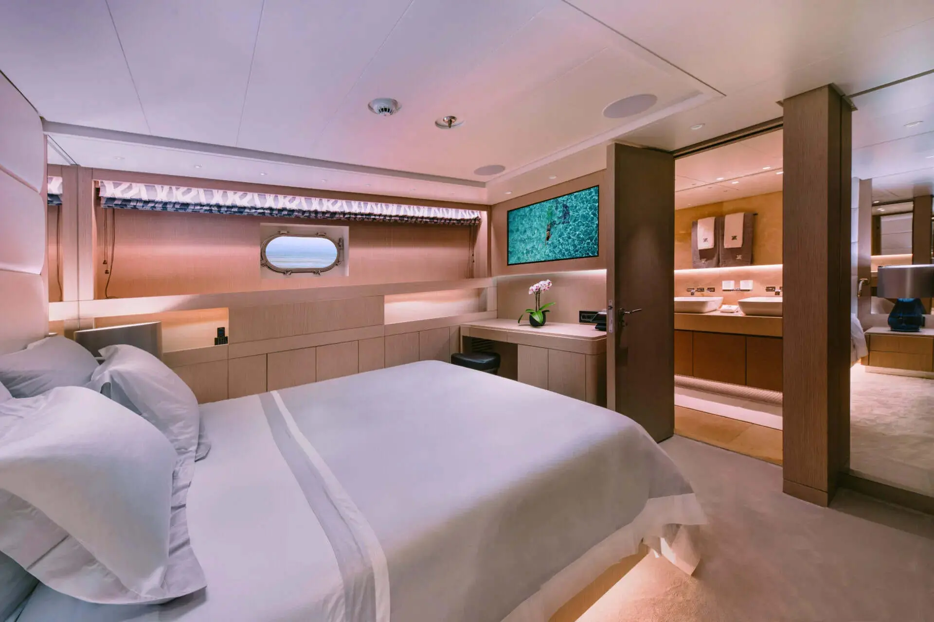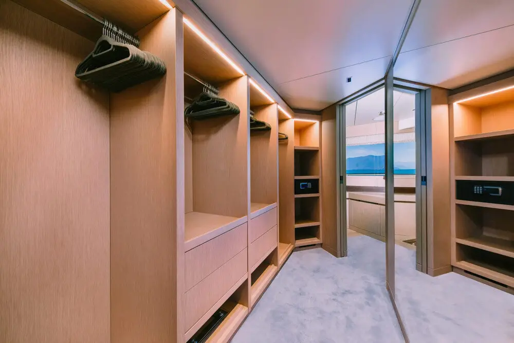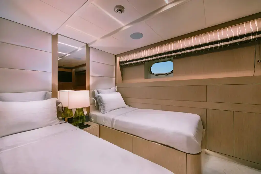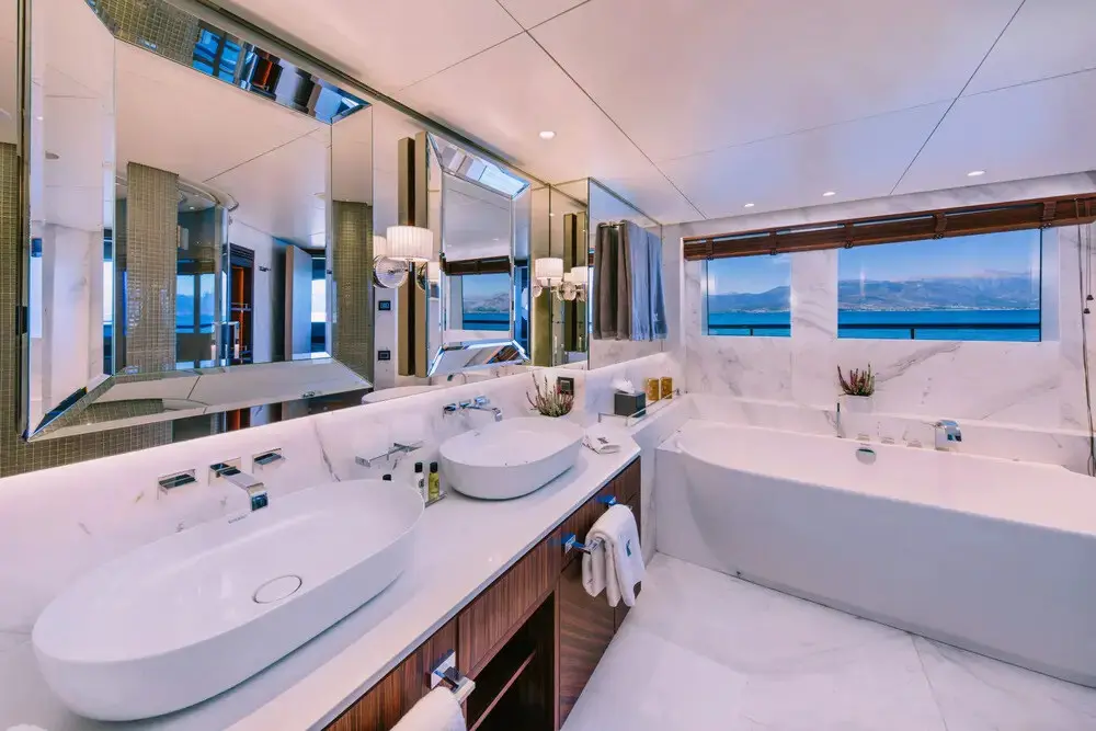 The master cabin is the centerpiece of the guest accommodation. On a yacht of this size, the master suite often becomes a private retreat within the larger charter experience. It gives the principal guests added comfort, privacy, and a more elevated onboard feel.