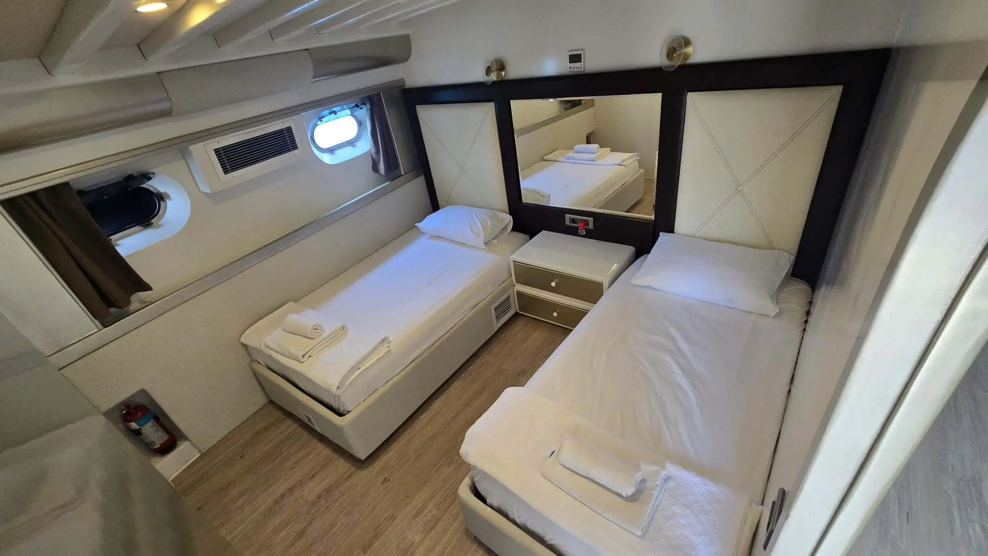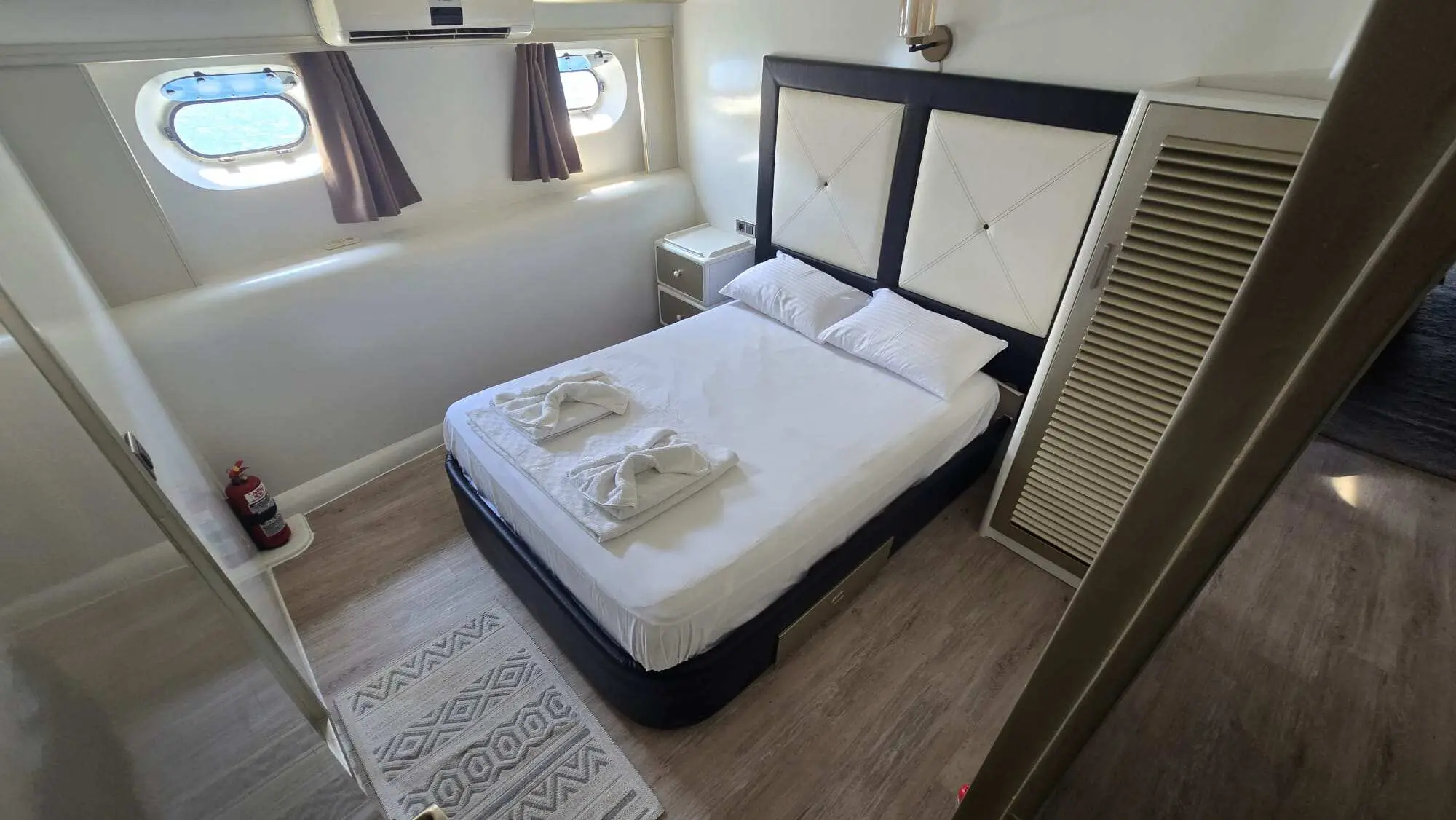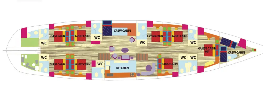Angelo II offers spacious accommodations for up to 14 guests in one master and six double cabins. Each cabin features air conditioning and private bathrooms, ensuring a comfortable stay for all guests. Each cabin is a sanctuary of comfort, featuring elegant decor, plush bedding, and modern amenities, making every stay aboard Angelo II restful and luxurious.