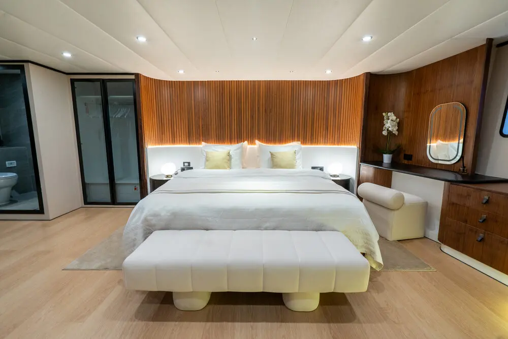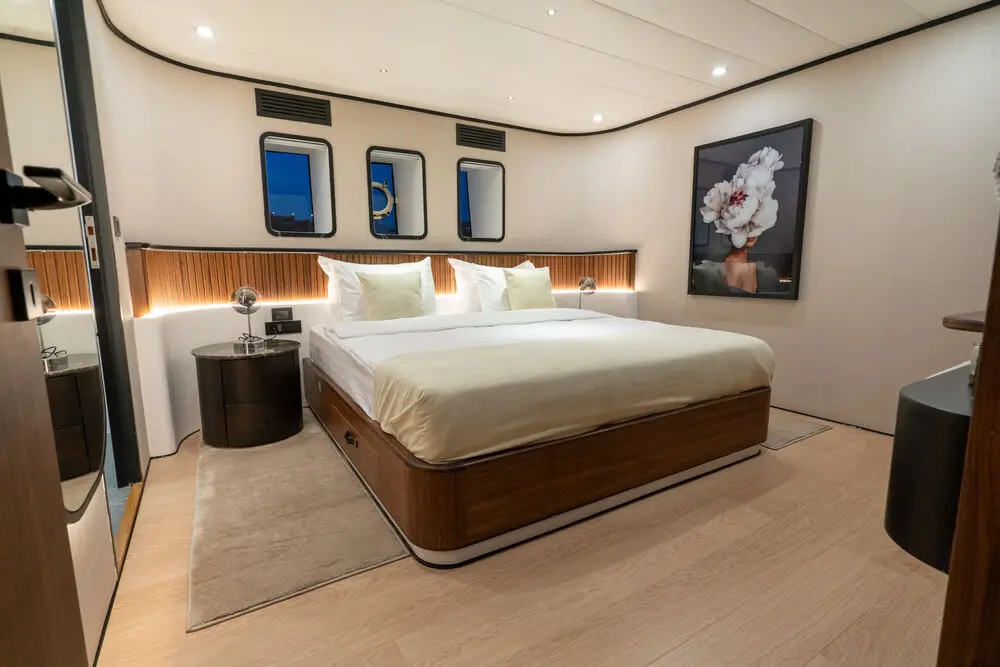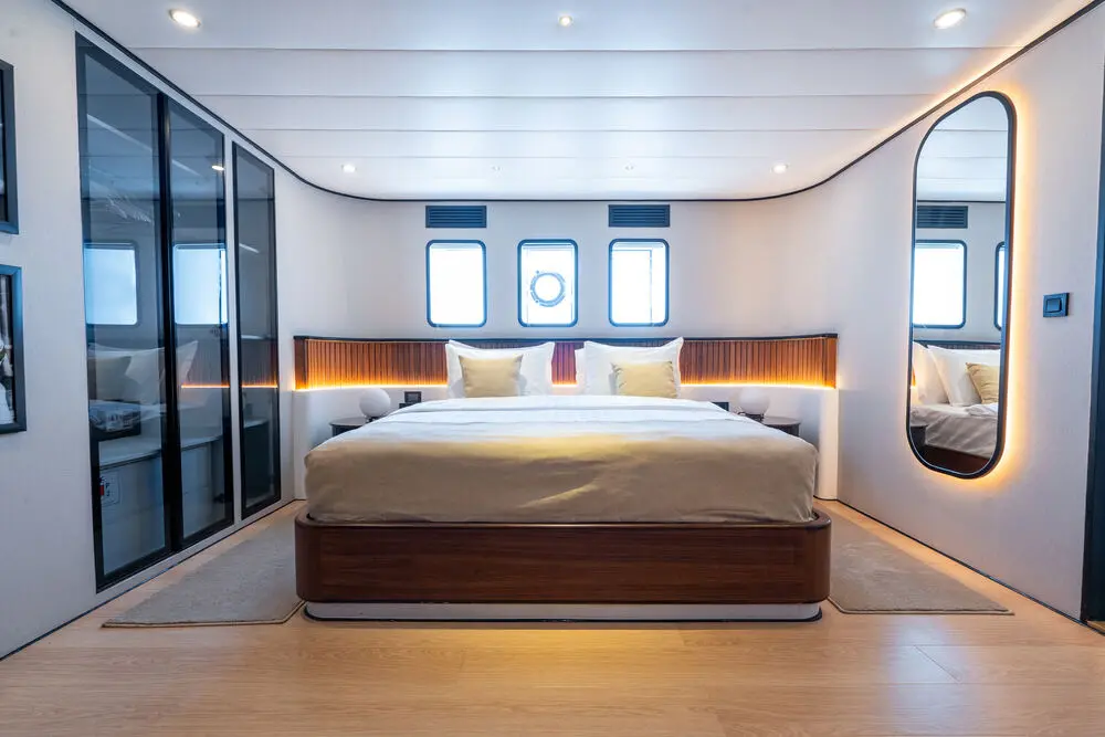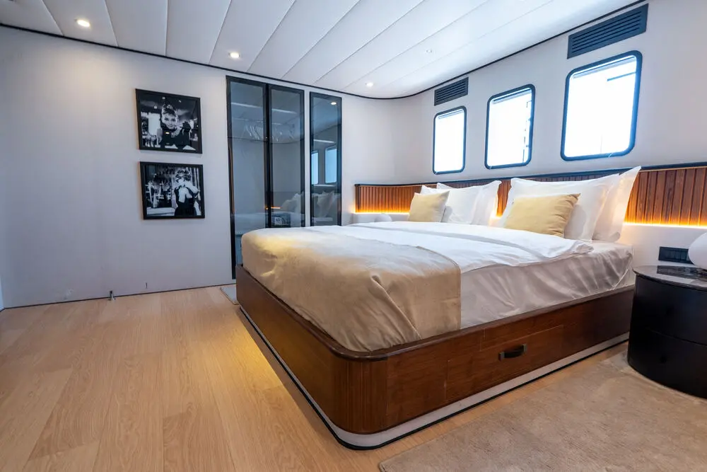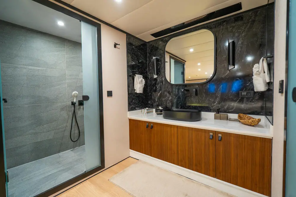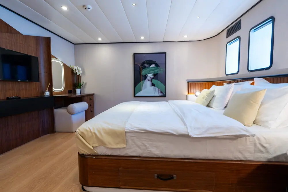 Gulet De Love offers luxurious accommodations for up to 14 guests in 7 cabins, making it ideal for larger groups or families. The cabin configuration includes: 6 VIP cabins – each offering plush bedding, elegant décor, and private ensuite bathrooms. 1 Master cabin – an expansive space with added luxury touches, perfect for the primary charter guest or group leader. All cabins are equipped with air conditioning, ensuring a comfortable stay no matter the weather conditions. The ensuite bathrooms are modern and well-appointed, providing the privacy and convenience of a luxury hotel.