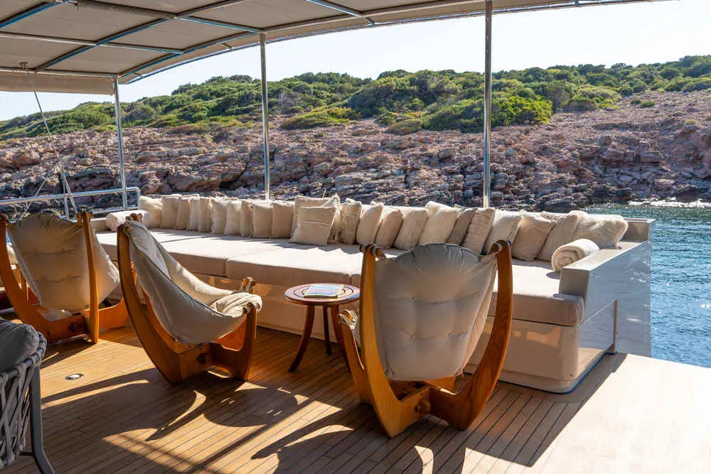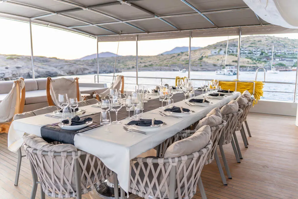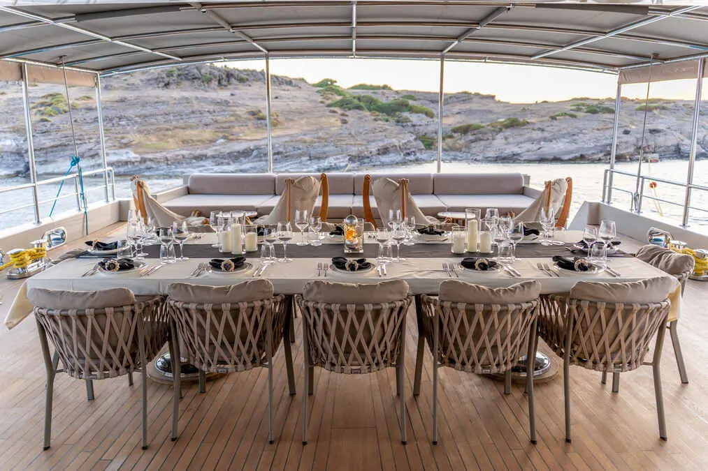 The expansive deck layout of gulet De Love provides plenty of space for outdoor living and activities. Guests can enjoy: Sun mattresses for lounging and sunbathing. Deck shower for rinsing off after a swim in the sea. Sun sail for shade, offering a cool retreat from the sun. Outdoor dining area for enjoying meals alfresco while taking in the stunning Mediterranean views. The deck is designed to offer both social spaces and private nooks, ensuring that guests can enjoy time together or find quiet spots for solitude.