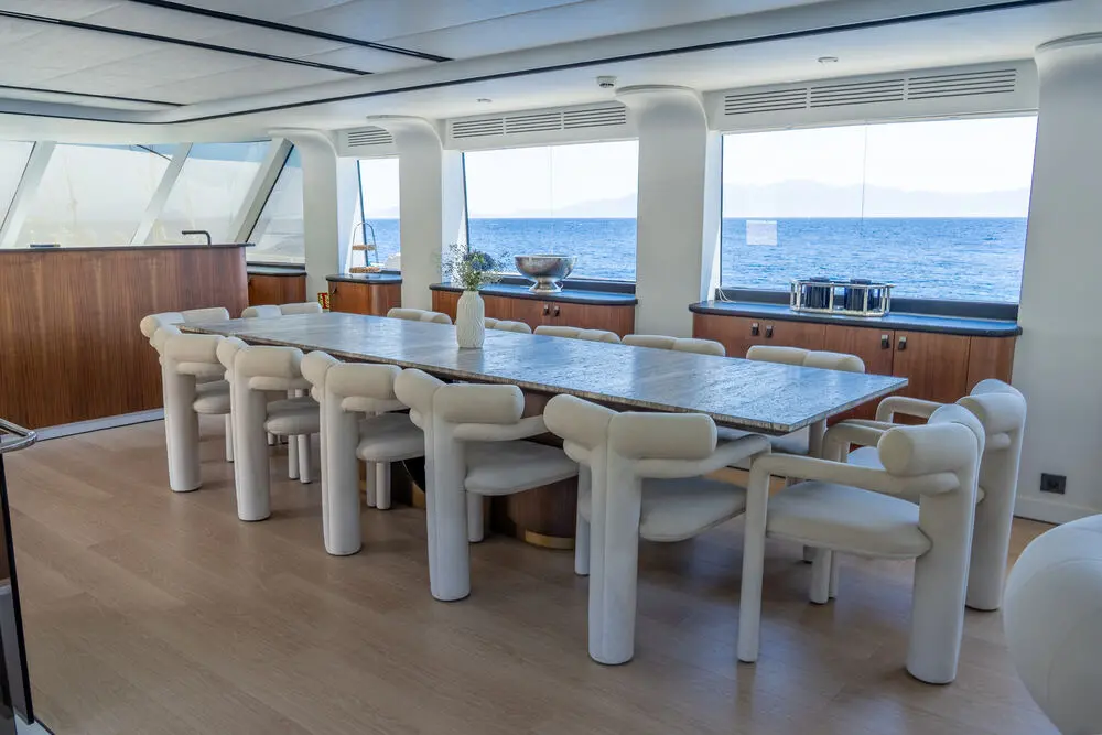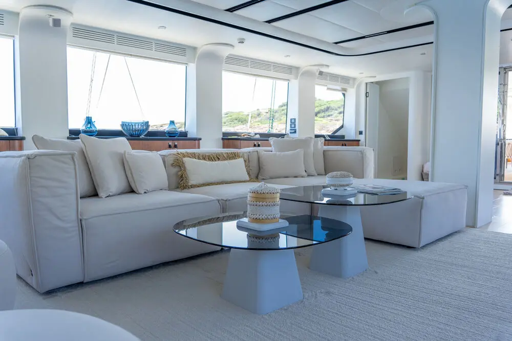 The interior spaces of gulet De Love have been designed with both style and comfort in mind. The large salon offers a lounge area where guests can relax, watch TV, or socialize. The dining area is similarly impressive, with room for all guests to dine together in a comfortable and elegant setting. With plush seating, large windows providing natural light, and high-end finishes throughout, the interior is a welcoming retreat after a day of sun and sea.