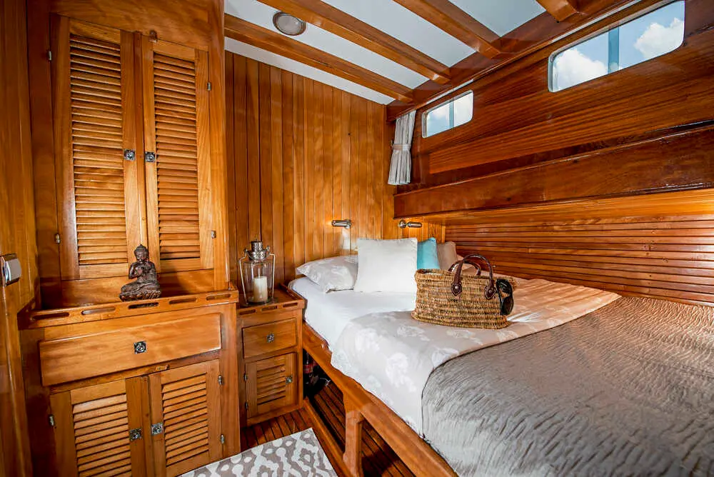 Guests can enjoy gourmet meals in the indoor restaurant, prepared by the onboard chef, or relax in the salon equipped with a TV, DVD player, and a robust music system. Wireless internet keeps everyone connected, even while at sea. Fortuna is stocked with a variety of water sports equipment, including a canoe, a ringo, and water skis, ensuring that guests have plenty of options for fun and exploration. The deck also offers ample space for sunbathing and relaxation.
