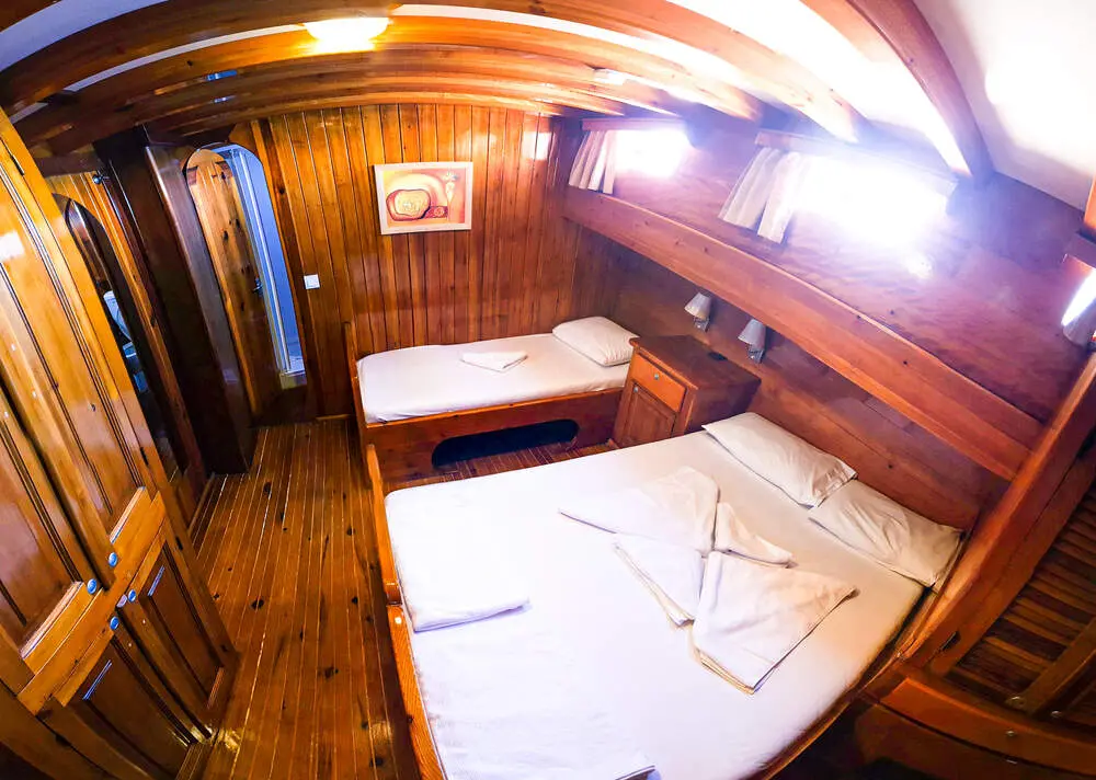 This gulet accommodates up to 18 guests across seven cabins: three double and four triple rooms, each featuring air conditioning and private bathrooms. The spacious layout ensures privacy and comfort for all guests. Each cabin is tastefully decorated and equipped with modern amenities such as home-type and electric toilets, shower boxes, and ample storage, providing a comfortable and inviting environment.