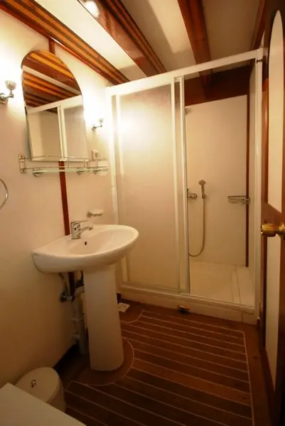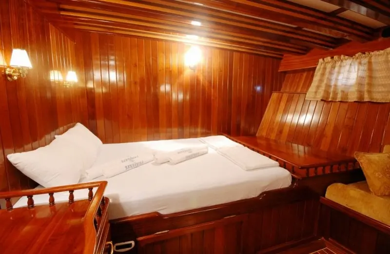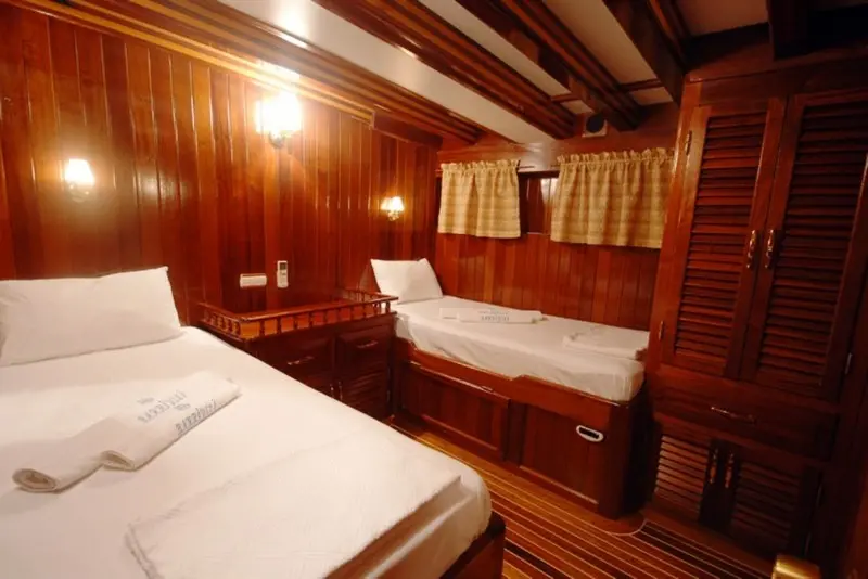 Bahriyeli D features eight comfortable cabins (two double and six twin), all equipped with air conditioning and en-suite bathrooms, ensuring privacy and comfort for up to 16 guests. The onboard facilities are designed to meet the needs of a diverse group of travelers.
