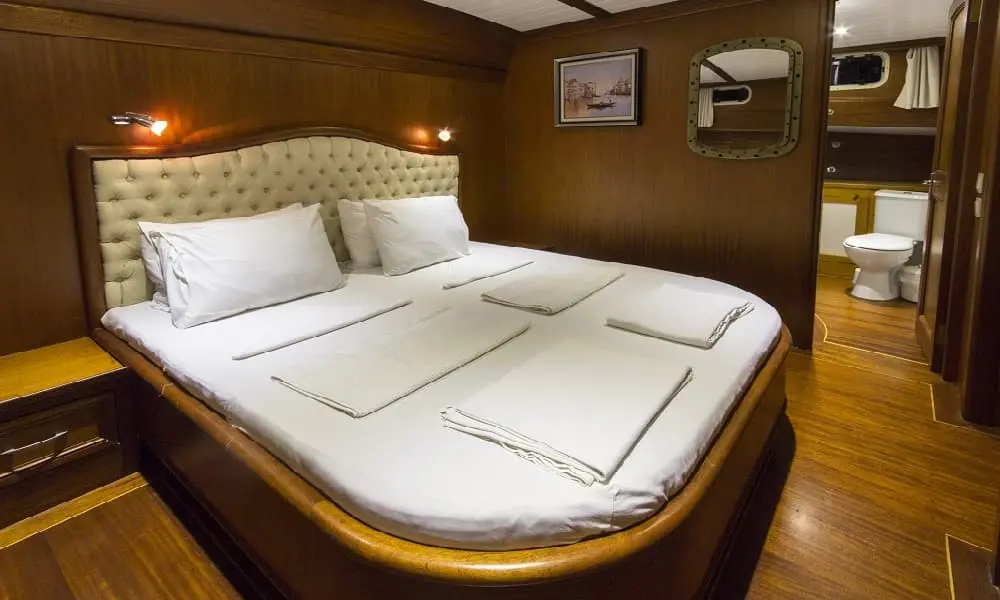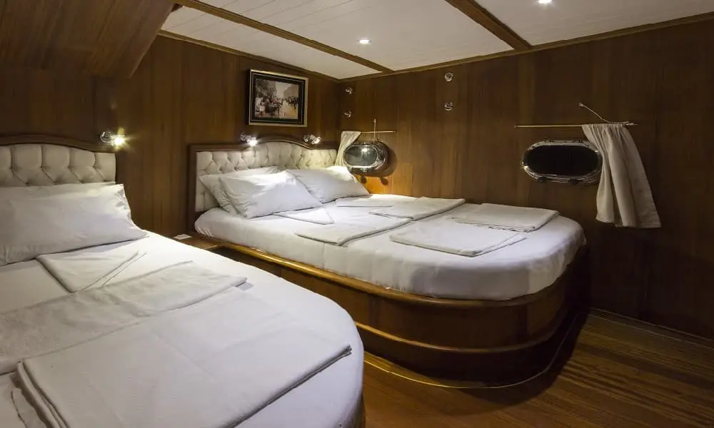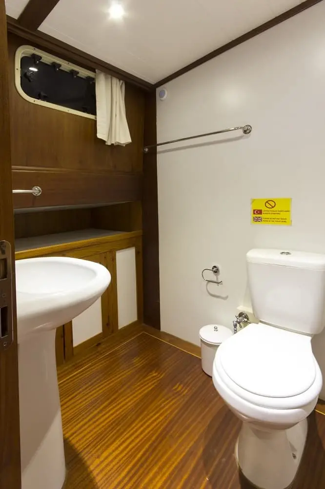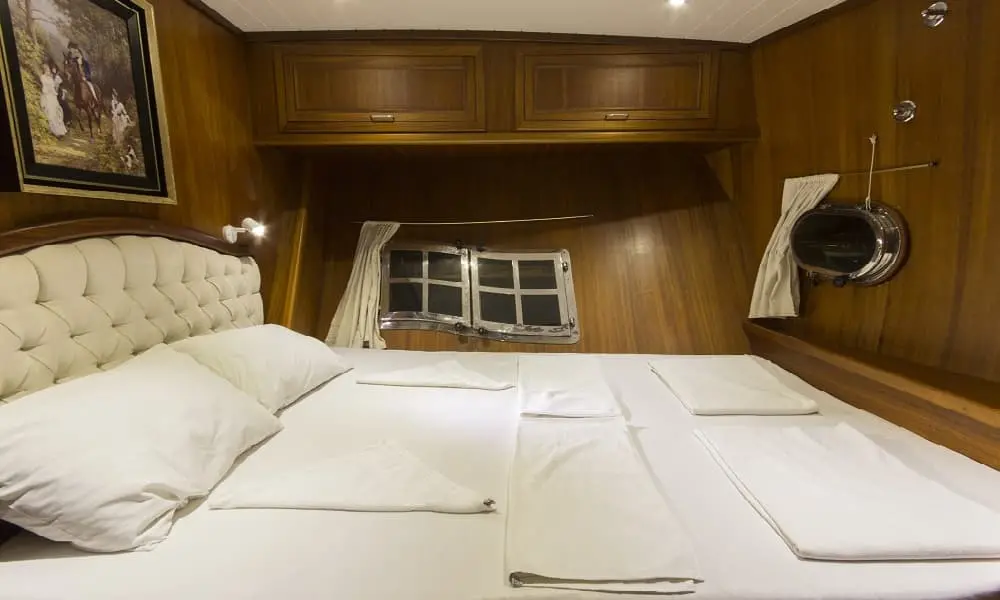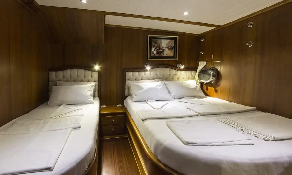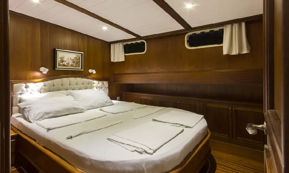 The gulet features 1 Master, 4 Double, and 3 Triple cabins, each furnished to a high standard and equipped with air conditioning and private bathrooms, providing a comfortable and private retreat for guests. A dedicated crew of five, including a captain, chef, and deckhands, is committed to providing exemplary service, ensuring all aspects of the journey are catered to the highest standards.
