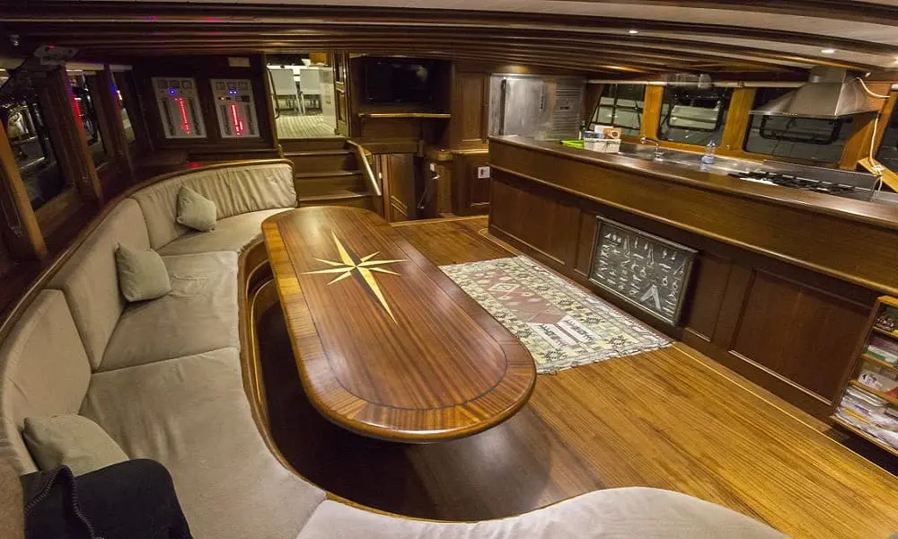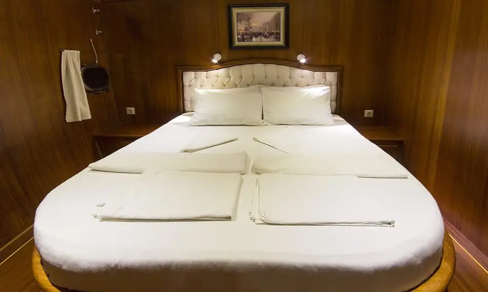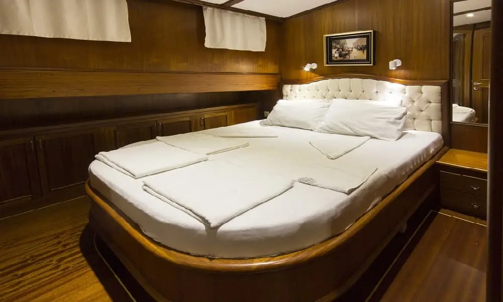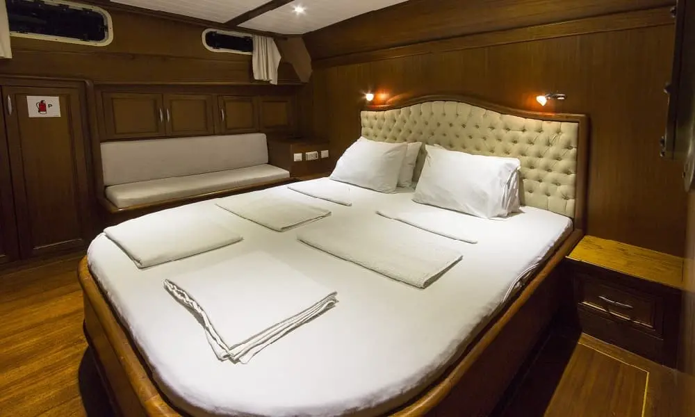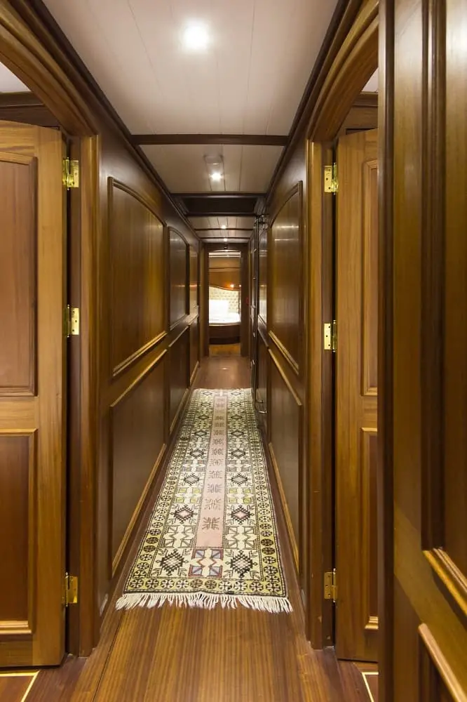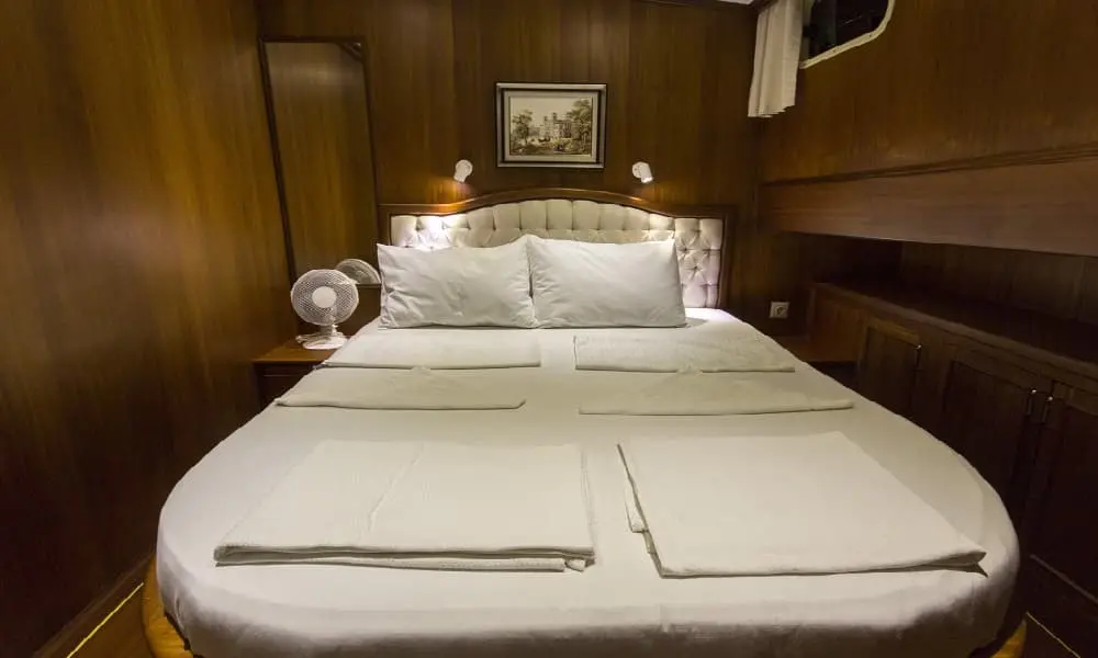 The gulet features 1 Master, 4 Double, and 3 Triple cabins, each furnished to a high standard and equipped with air conditioning and private bathrooms, providing a comfortable and private retreat for guests. A dedicated crew of five, including a captain, chef, and deckhands, is committed to providing exemplary service, ensuring all aspects of the journey are catered to the highest standards.