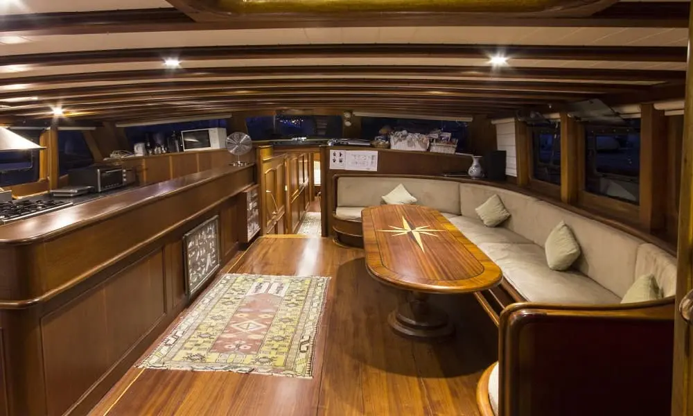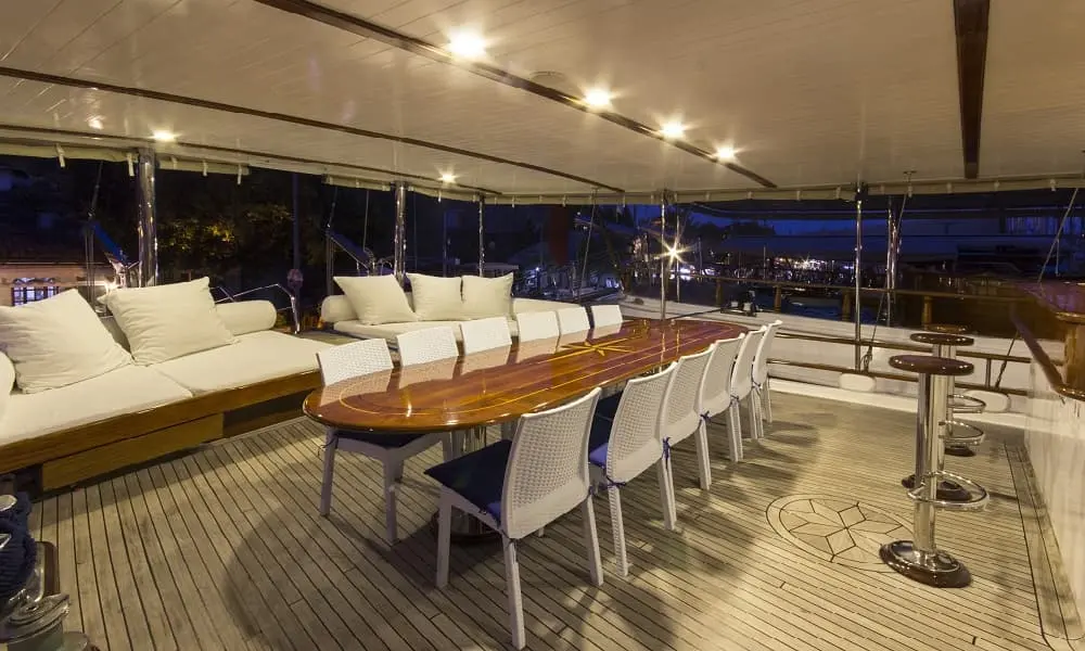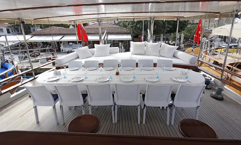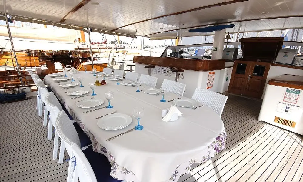 Guests on Gulet Cemre IV can enjoy a variety of entertainment options, including an indoor restaurant, a TV and DVD player in the salon, a comprehensive music system, and wireless internet. For those seeking adventure, there are water sports facilities like a canoe, ringo, and windsurfing. The onboard dining experience is a culinary delight, with a chef dedicated to preparing a range of delicious meals that can cater to various dietary preferences, ensuring every meal is both a treat and a memorable part of the sailing experience.