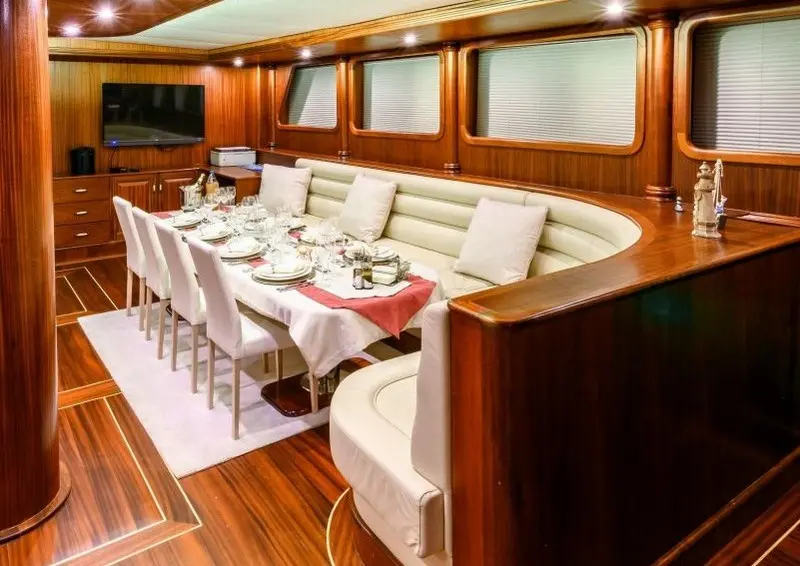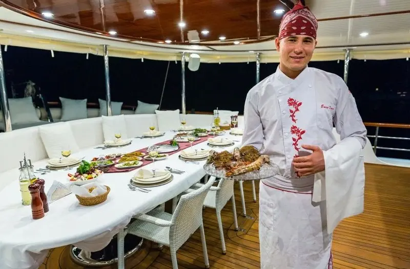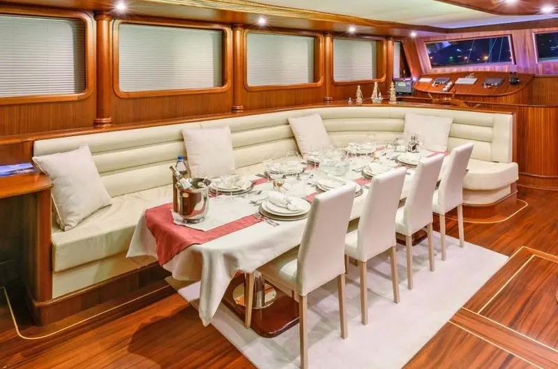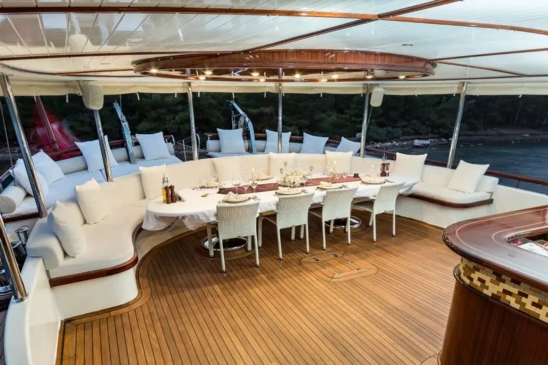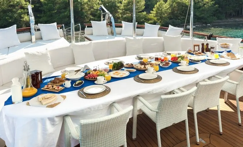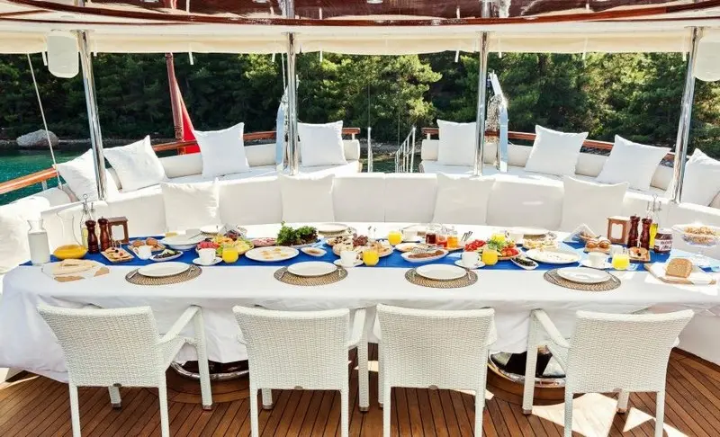 Dining is a highlight of any voyage aboard the Halcon Del Mar, with a chef onboard to prepare fresh and delectable meals. Guests can enjoy a mix of Turkish delicacies and international favorites, complemented by local wines and fresh ingredients sourced from coastal markets.