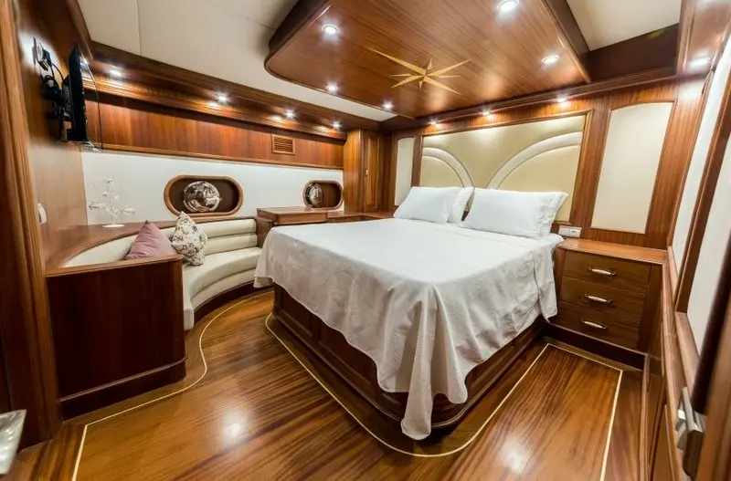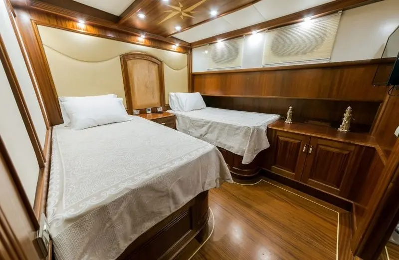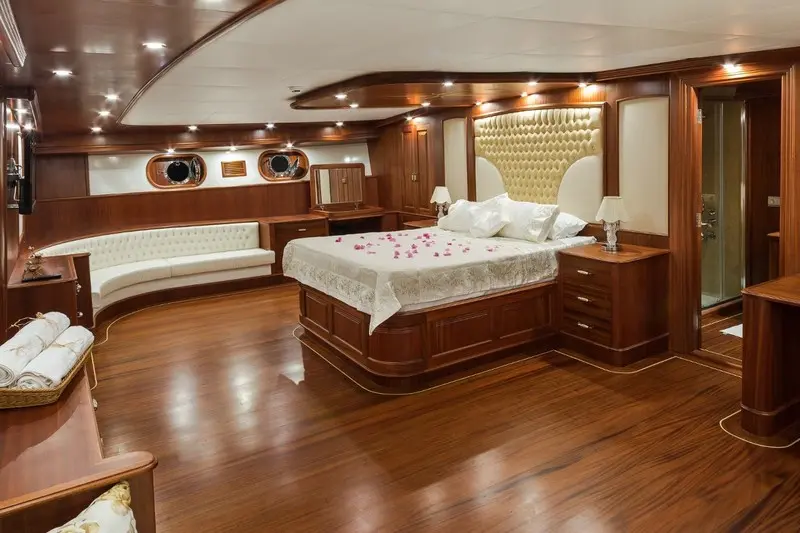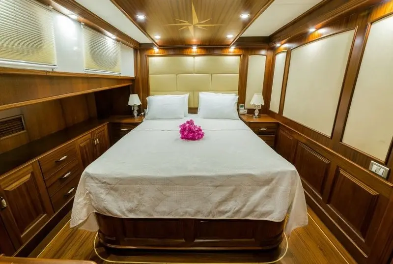 Special menus, including vegetarian and gluten-free options, can be arranged to cater to specific dietary needs.The accommodation aboard the Halcon Del Mar is second to none, featuring a variety of cabin types to suit different preferences. The gulet is equipped with 2 master cabins, 4 double cabins, and 2 twin cabins, all furnished with elegant décor and spacious interiors.