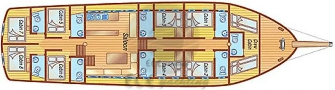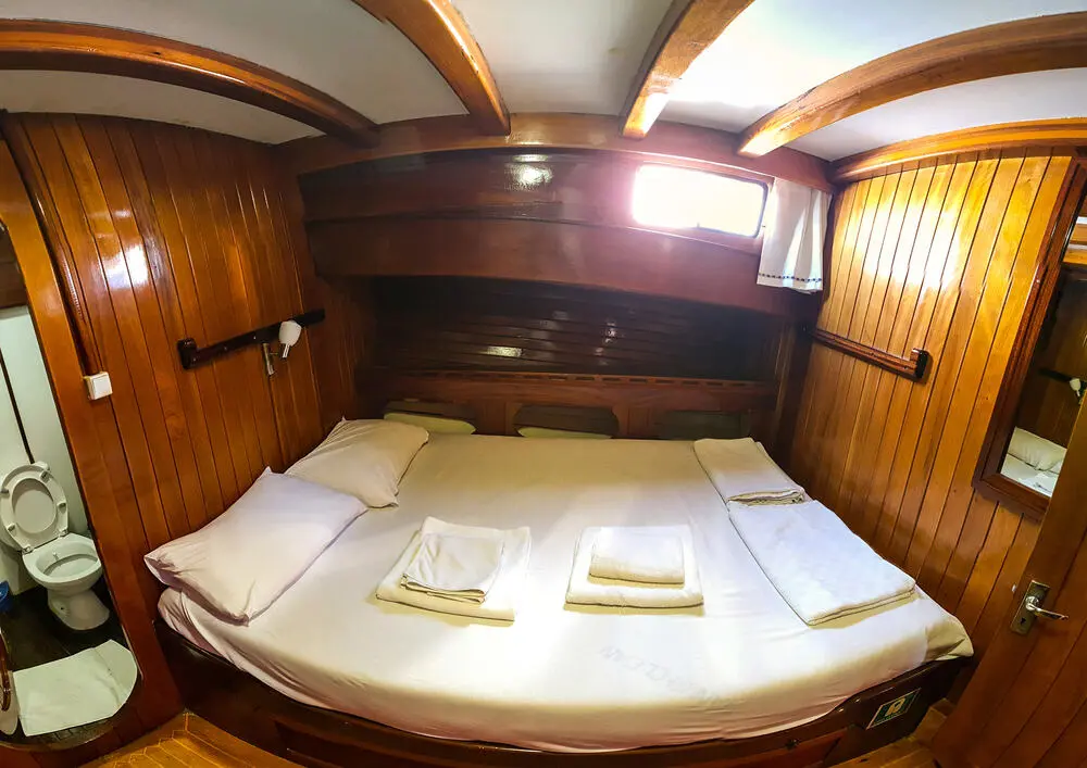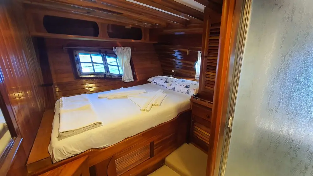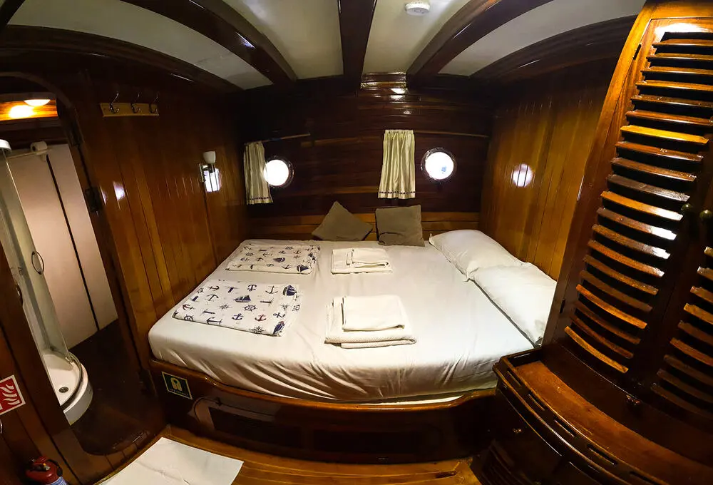 The gulet features eight inviting cabins—six double and two twin—each outfitted with air conditioning, en-suite bathrooms, and modern amenities to ensure comfort and privacy. The elegant design and spacious accommodations cater to relaxation and luxury.