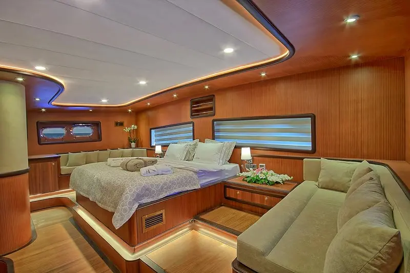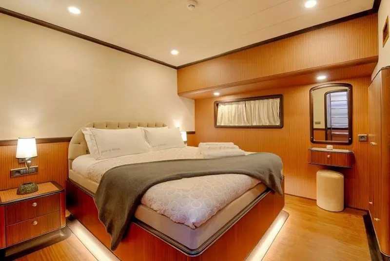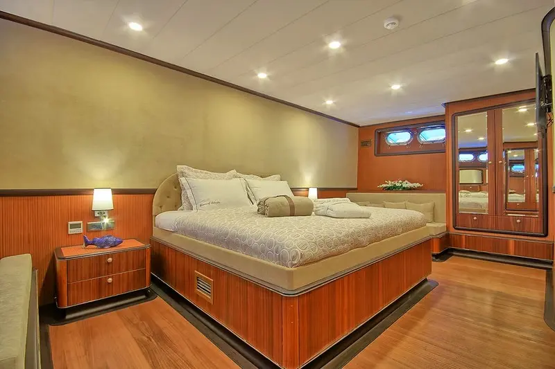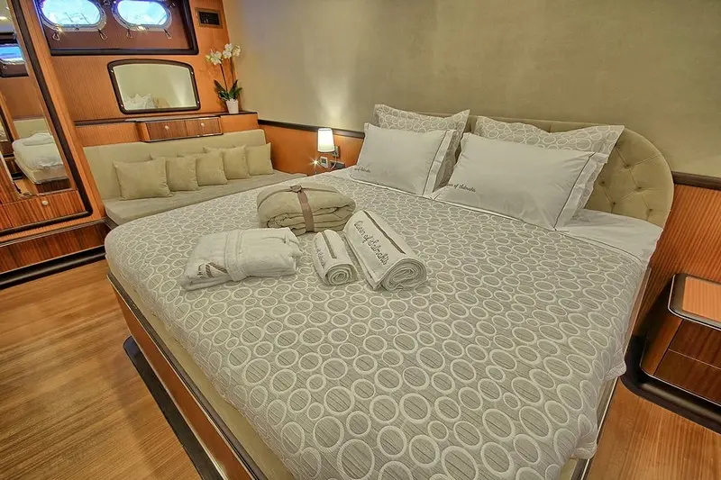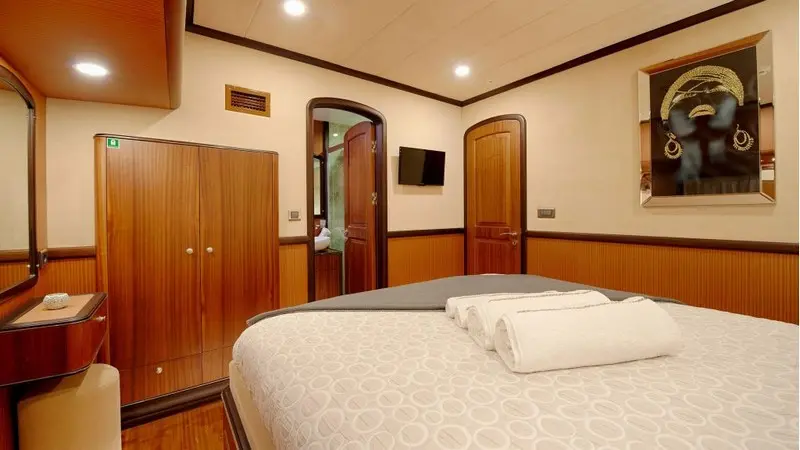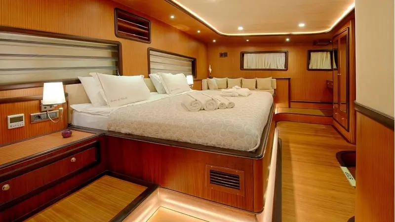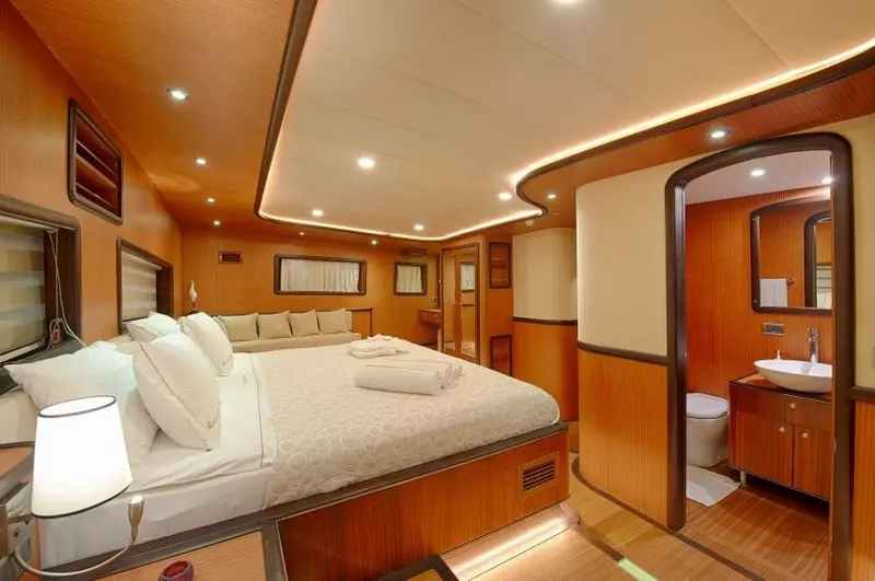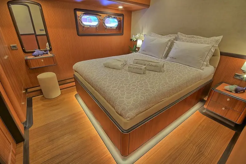 Gulet Queen of Salmakis features a mix of 2 master suites, 4 double cabins, and 2 triple cabins, all equipped with air conditioning and private shower facilities. Each cabin is designed to offer comfort and luxury, reflecting the gulet’s commitment to excellence in guest accommodation.