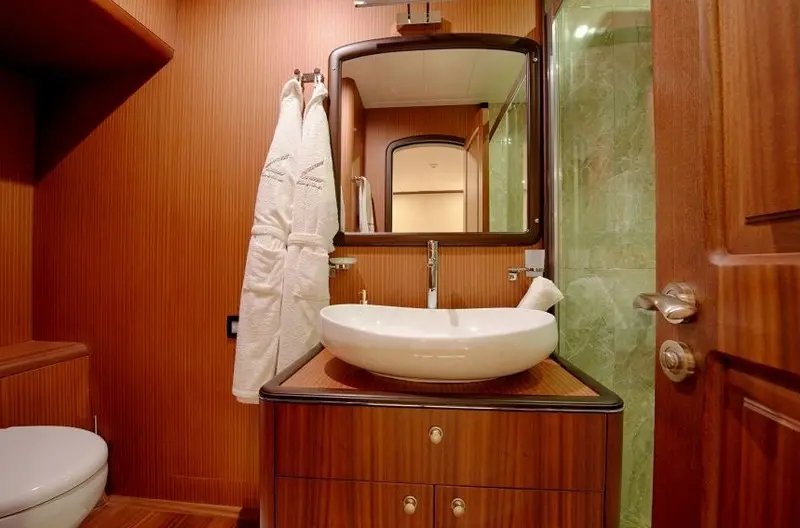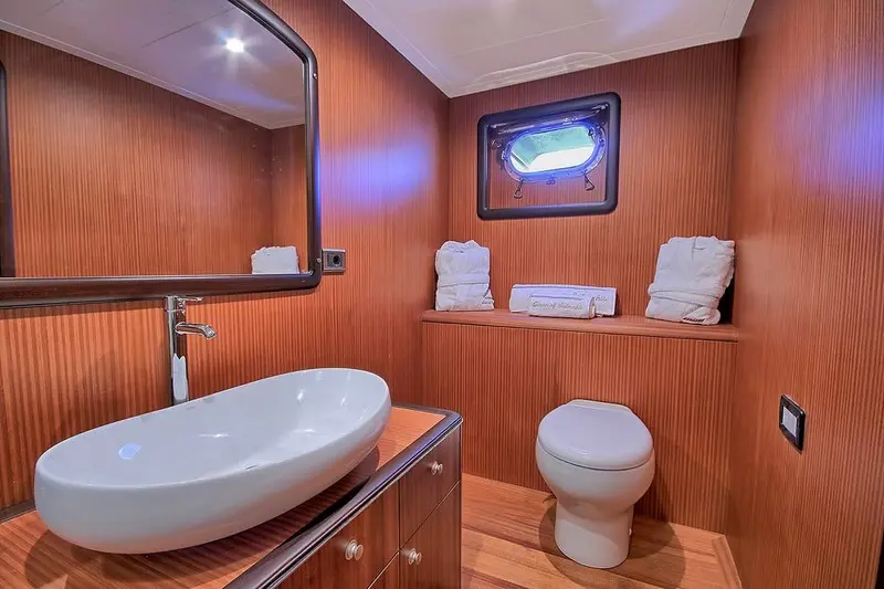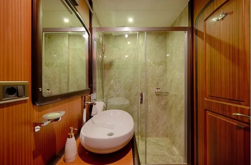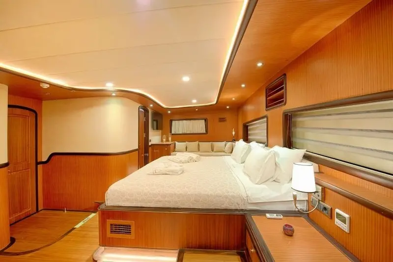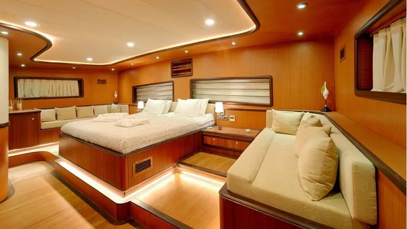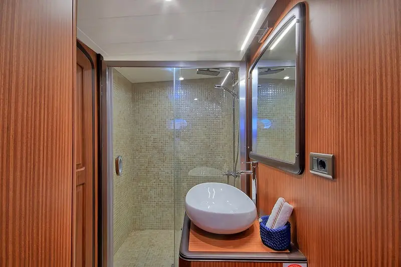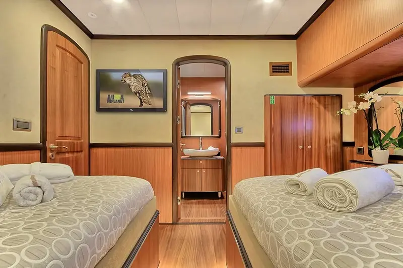 Gulet Queen of Salmakis features a mix of 2 master suites, 4 double cabins, and 2 triple cabins, all equipped with air conditioning and private shower facilities. Each cabin is designed to offer comfort and luxury, reflecting the gulet’s commitment to excellence in guest accommodation.