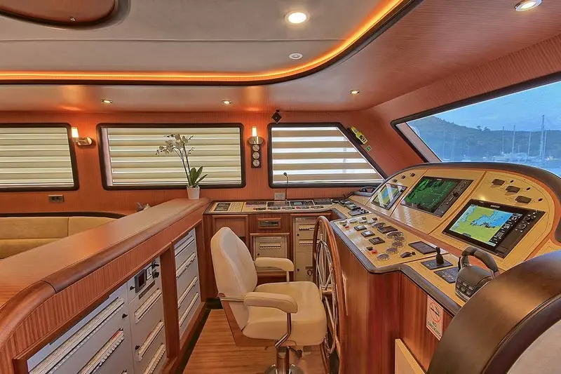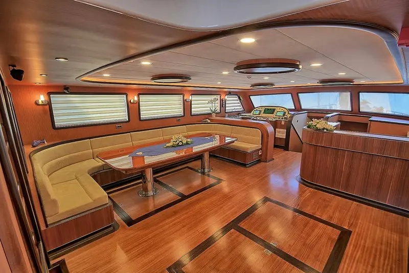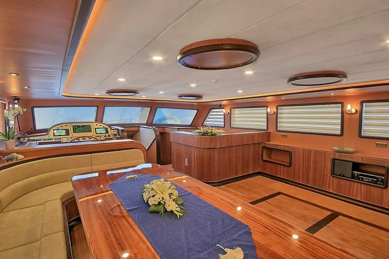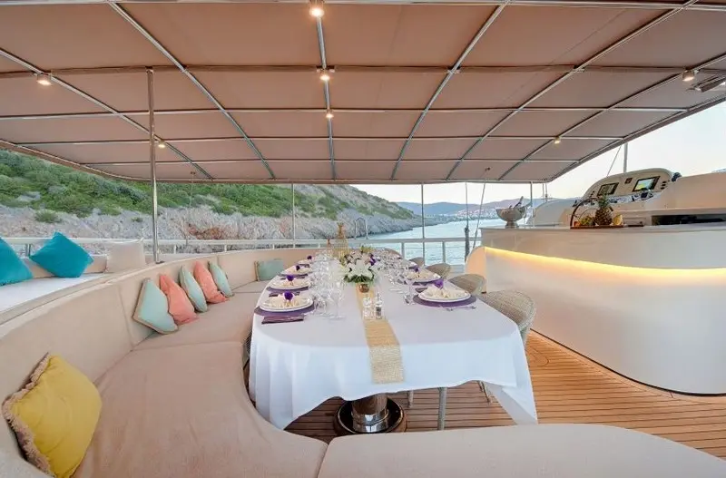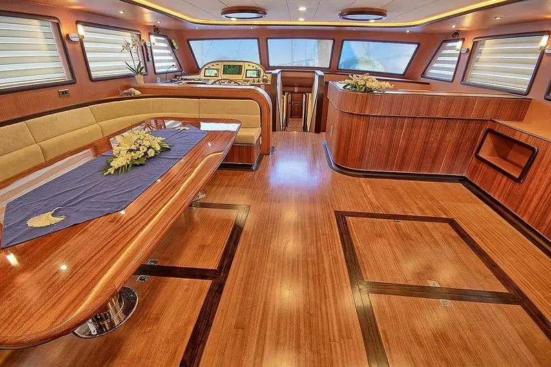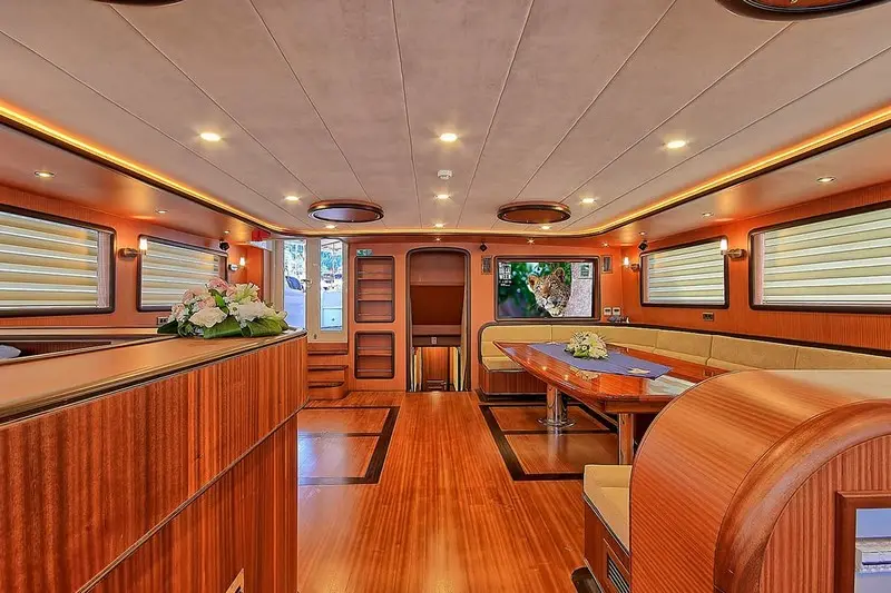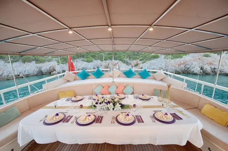 The onboard dining experience is a culinary delight, with a dedicated chef who prepares a variety of delicious dishes ranging from authentic Turkish flavors to international cuisine. Meals are served in an elegant indoor dining area, offering panoramic views of the sea.