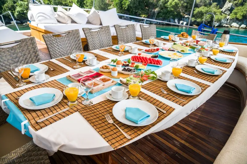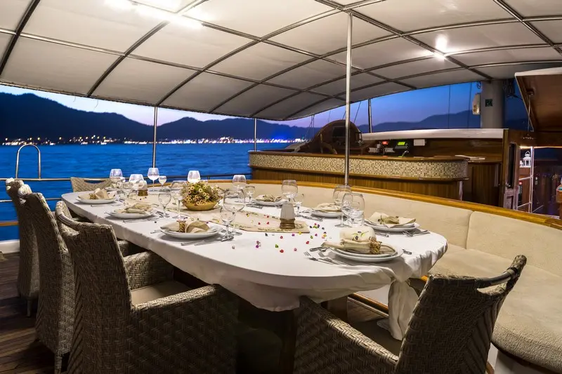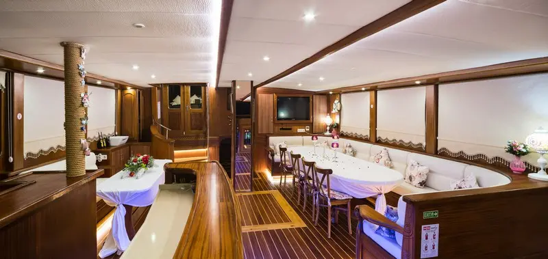 Guests aboard Gulet S Nur Taylan can savor delicious Mediterranean dishes prepared by the onboard chef, featuring fresh, locally sourced ingredients. The indoor restaurant provides a delightful setting for meals, enhancing the overall culinary experience.