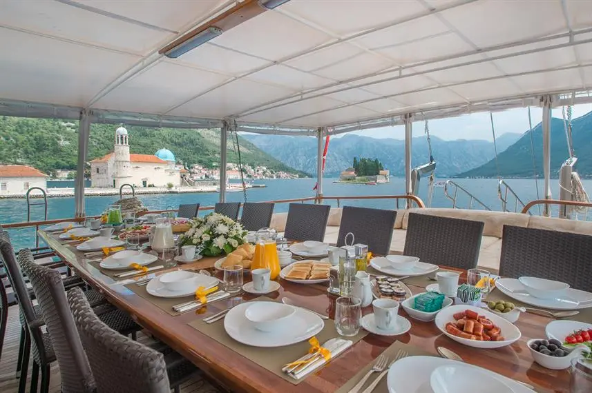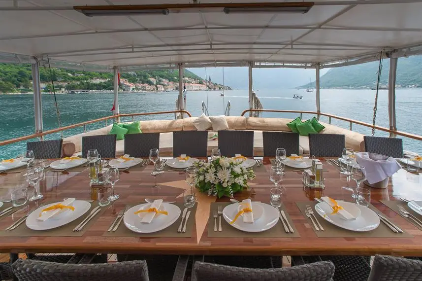 Dining on the Gulet Sadri Usta is a gourmet experience, with meals prepared by a skilled onboard chef who specializes in both local Turkish and international cuisines. Guests can enjoy their meals in either the indoor or outdoor dining areas, with the option to customize menus to suit personal tastes and dietary requirements. The dining experience is enhanced by the breathtaking views of the Turkish coast, creating an unforgettable atmosphere for every meal. The vessel also offers a well-stocked bar, featuring a selection of fine wines, spirits, and non-alcoholic beverages.