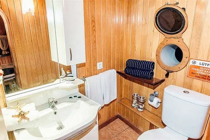 The Gulet Sadri Usta features a well-thought-out cabin layout designed to maximize comfort and privacy for its guests. The vessel includes six double cabins and two twin cabins, accommodating up to 16 guests. Each cabin is equipped with modern amenities, including en-suite bathrooms and home-type toilets, providing a comfortable and home-like atmosphere. The cabins are tastefully decorated, combining traditional Turkish design elements with modern comfort, ensuring a relaxing retreat for all onboard.