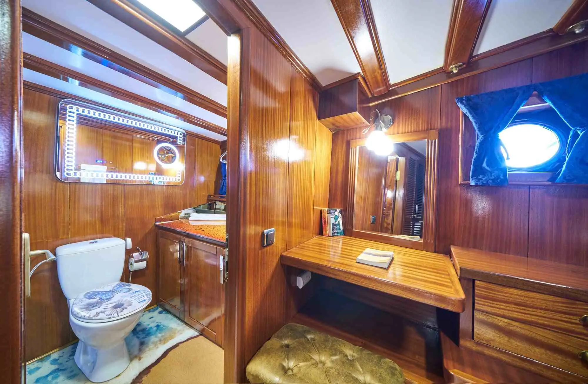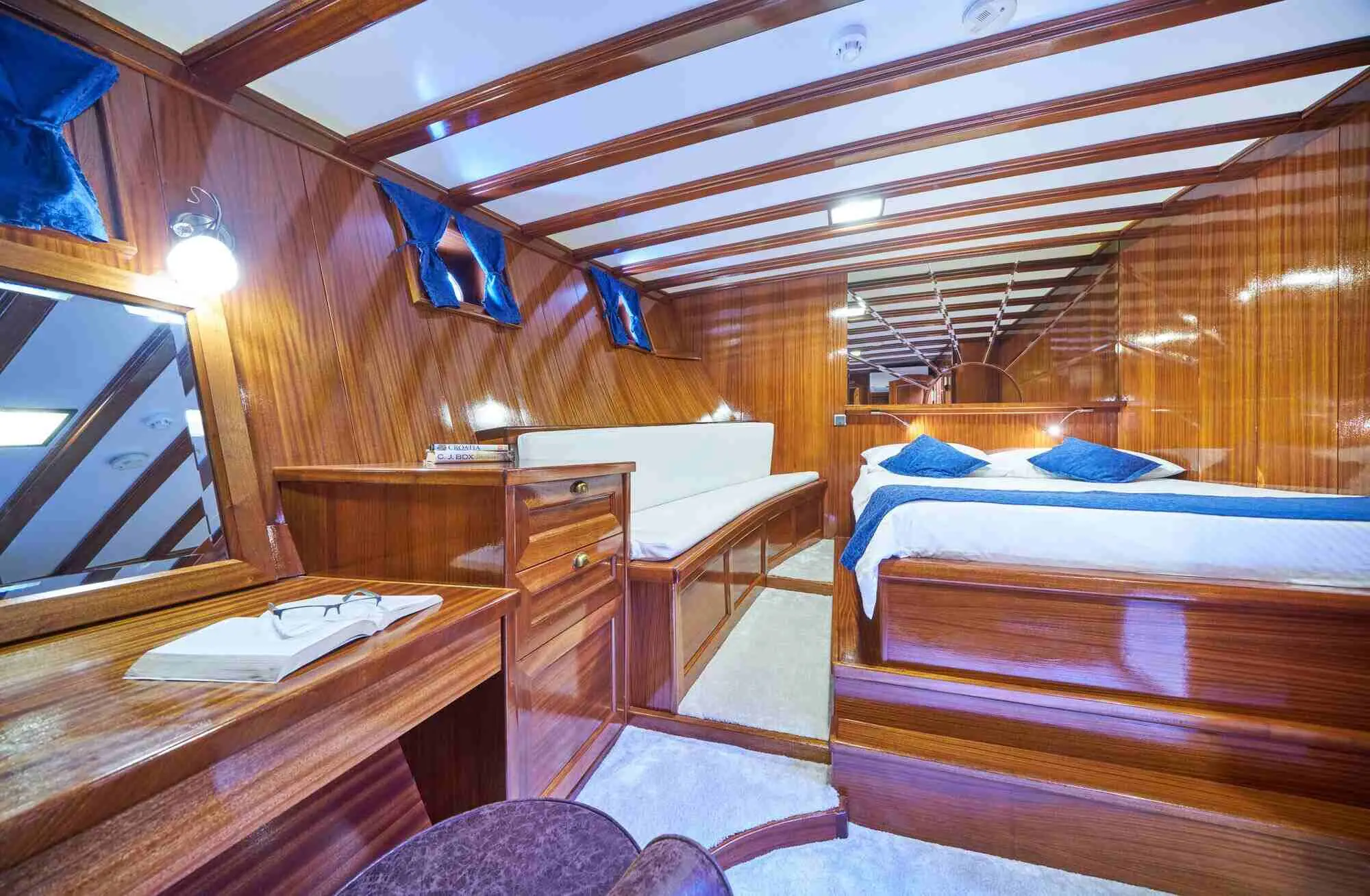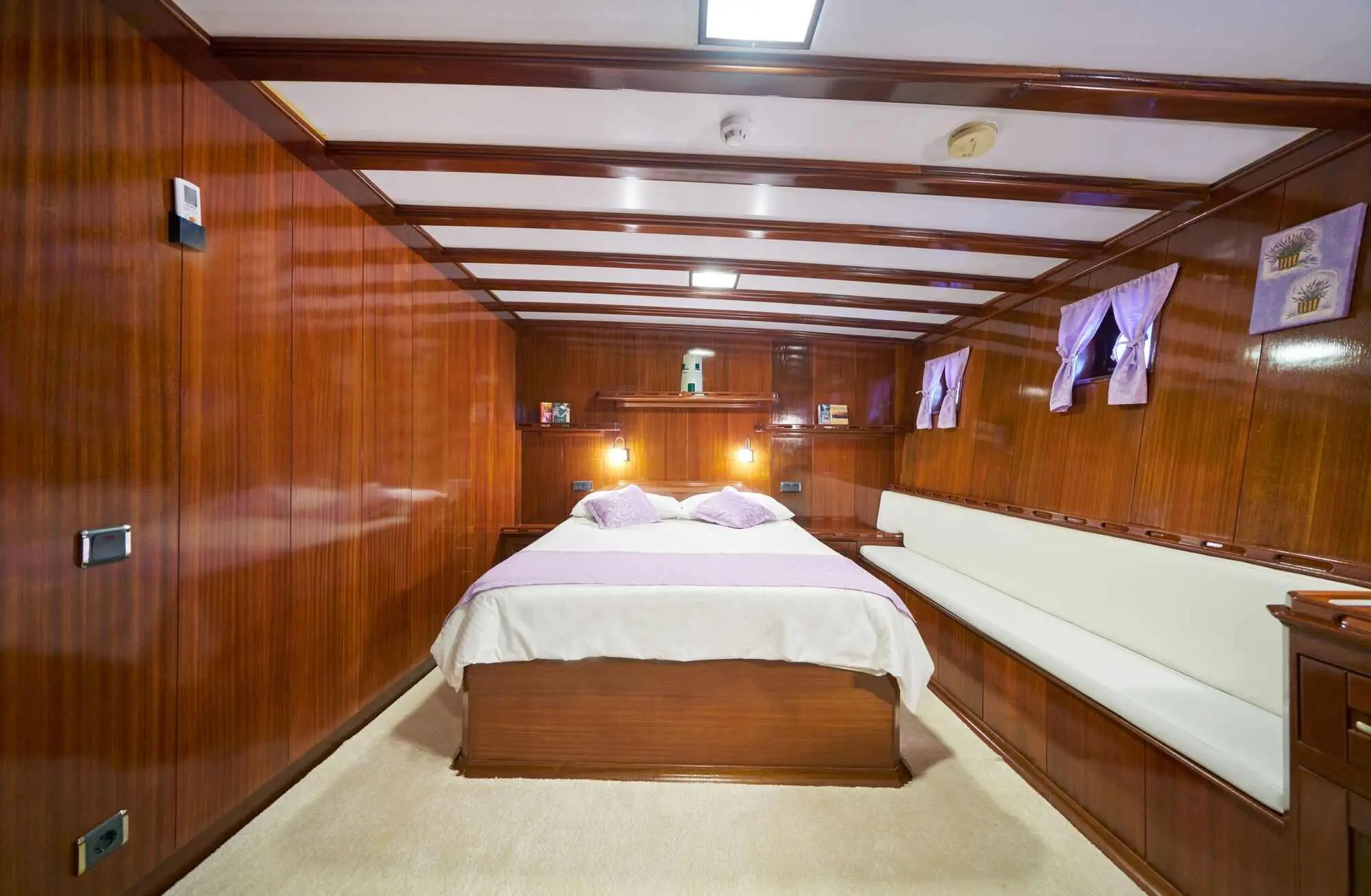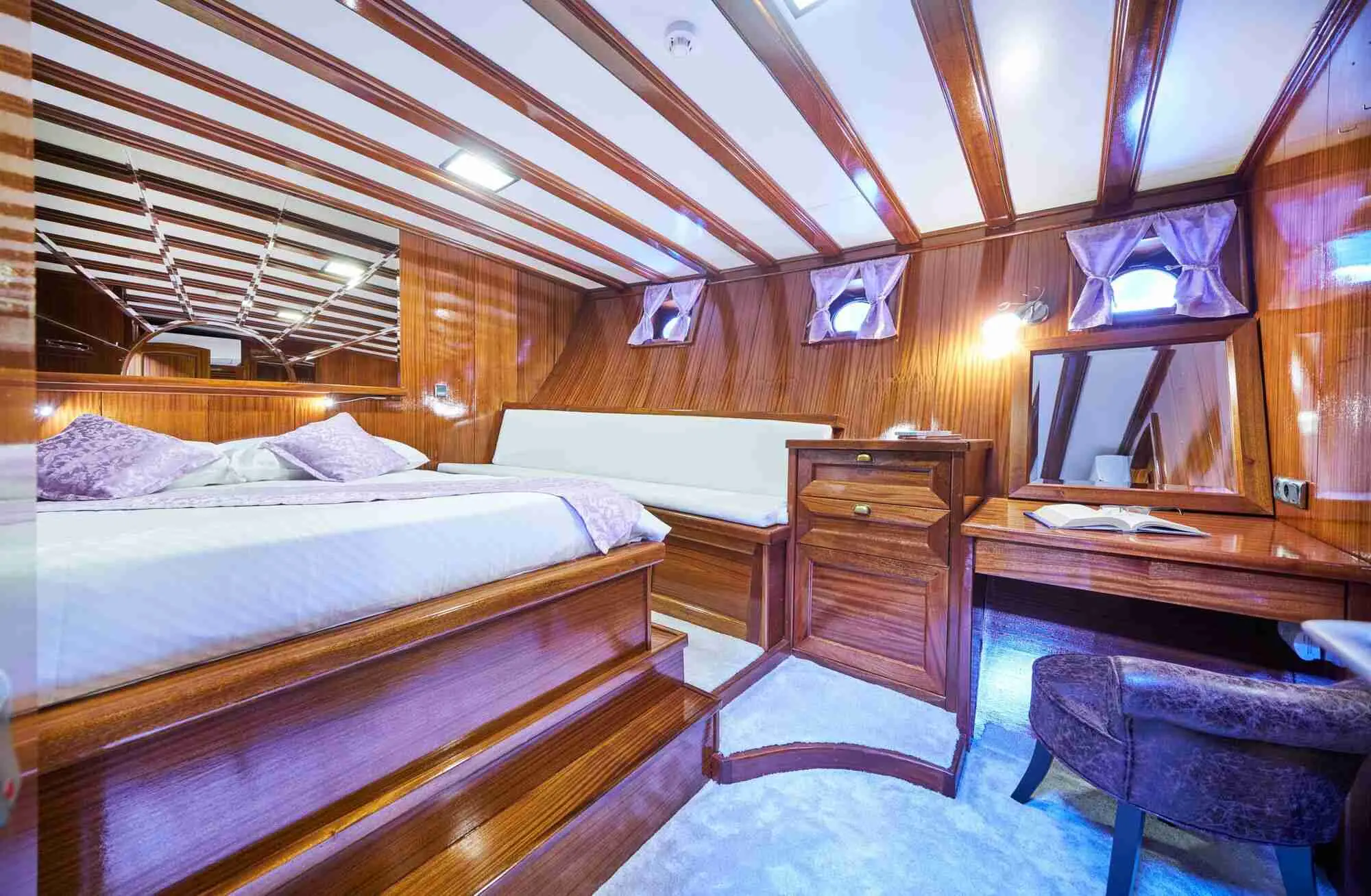 The gulet features eight well-appointed cabins, including six double and two twin, all equipped with modern amenities such as air conditioning, private bathrooms, and luxurious furnishings to ensure guest comfort throughout the voyage. A professional crew of six is committed to providing top-tier service, focusing on every detail of the guest experience, from navigation to gourmet dining, ensuring personalized attention throughout the journey.