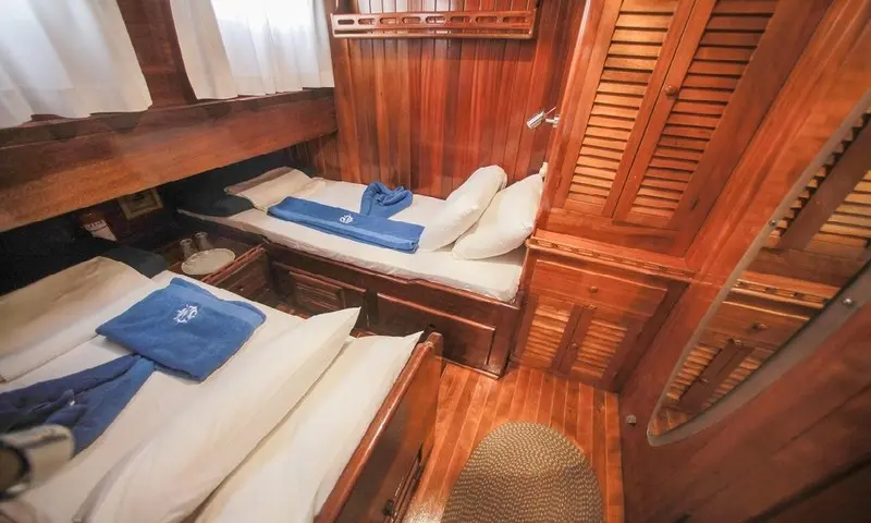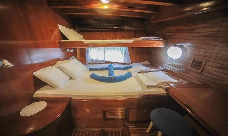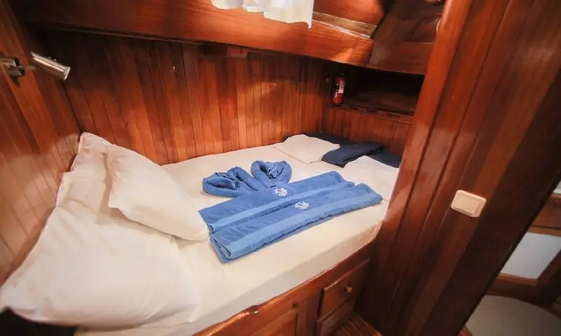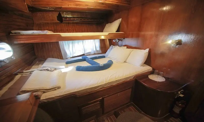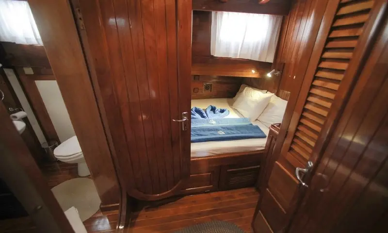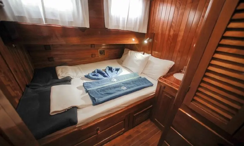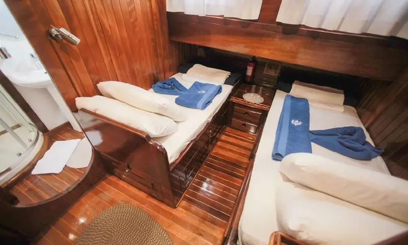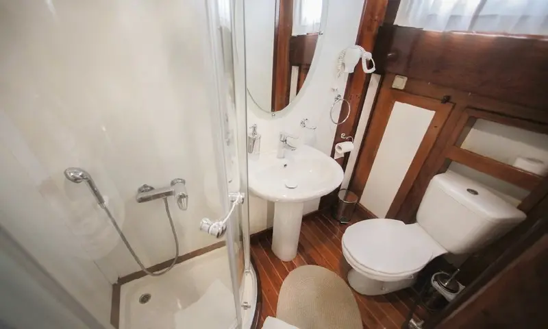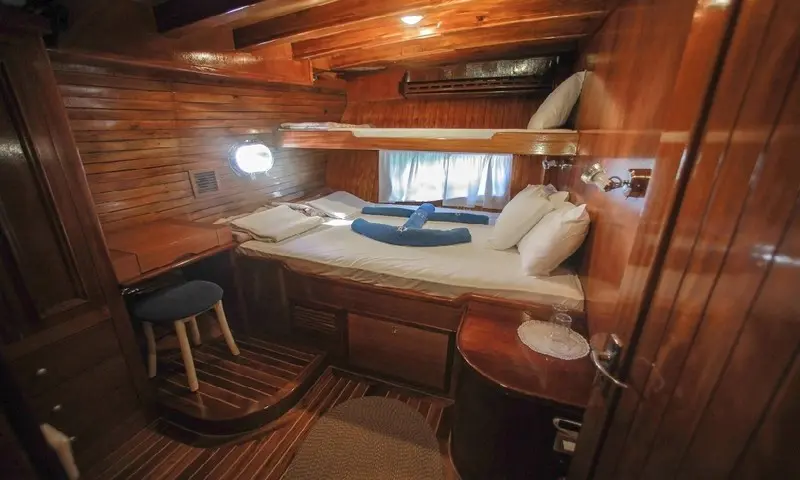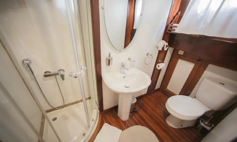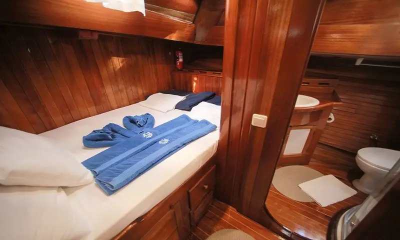 The gulet features eight comfortable cabins, including four double and four twin, all equipped with air conditioning, en-suite bathrooms, and home-style toilet facilities, ensuring privacy and comfort for all guests. A professional crew of four, including a skilled captain, a gourmet chef, and attentive deckhands, is dedicated to providing exceptional service. Their expertise ensures every aspect of the journey is catered to, from navigation to dining, making each moment onboard memorable.