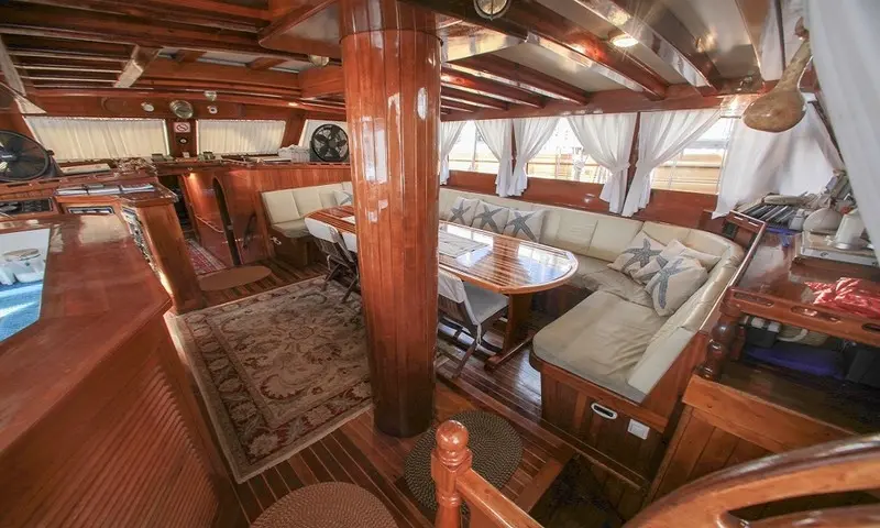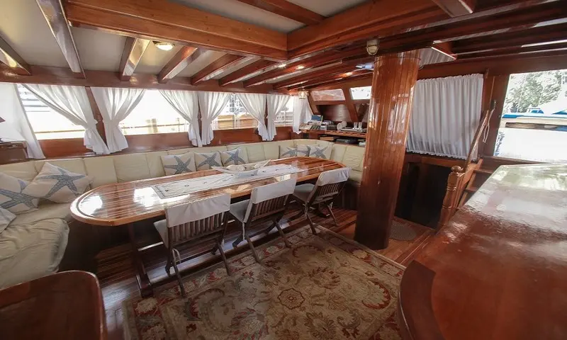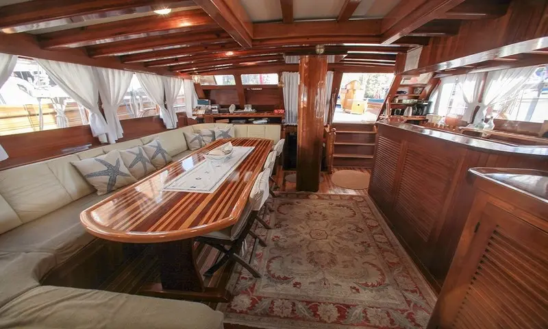 Onboard entertainment includes a TV and DVD player in the salon, a comprehensive music system, and wireless internet access. Guests can also enjoy a variety of water sports, such as canoeing, available to enhance the adventure and exploration aspects of the journey. The indoor restaurant on Gulet Sultan A offers a delightful dining experience with meals prepared by the onboard chef. The cuisine focuses on Mediterranean flavors with an emphasis on fresh, locally sourced ingredients, catering to all tastes and dietary needs.