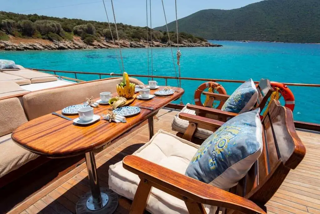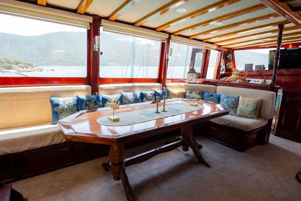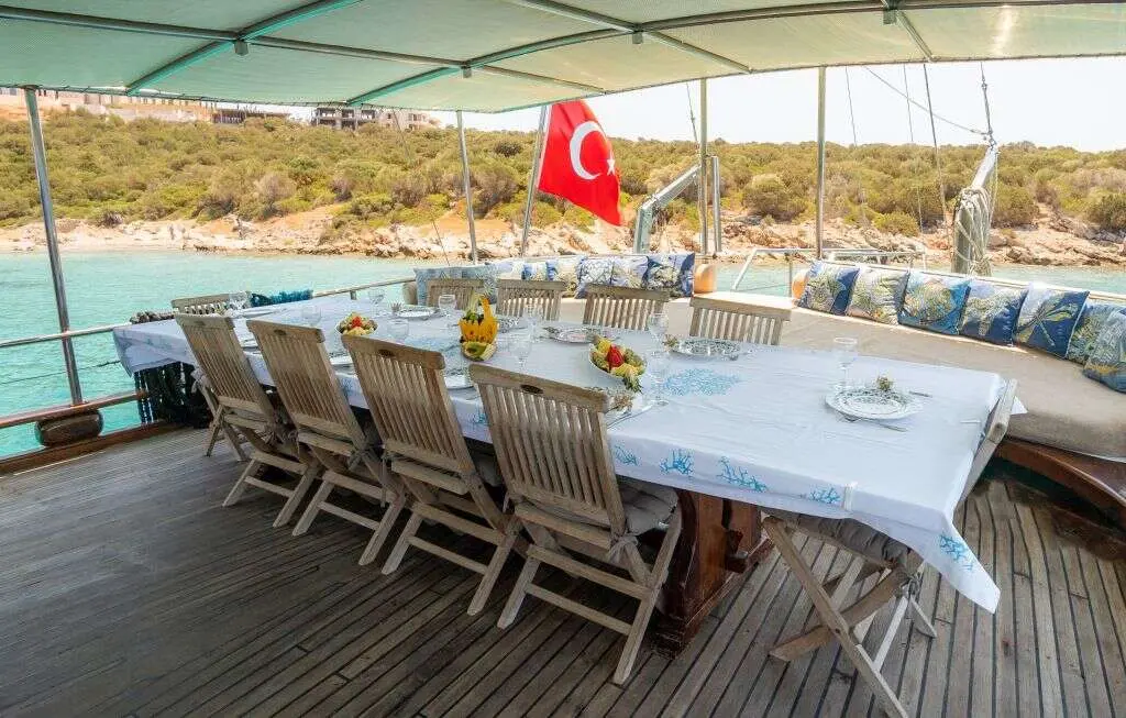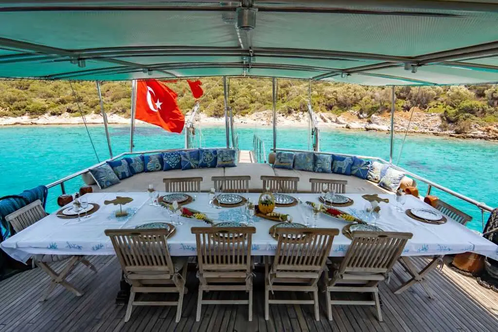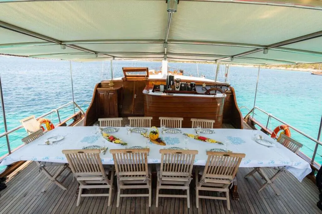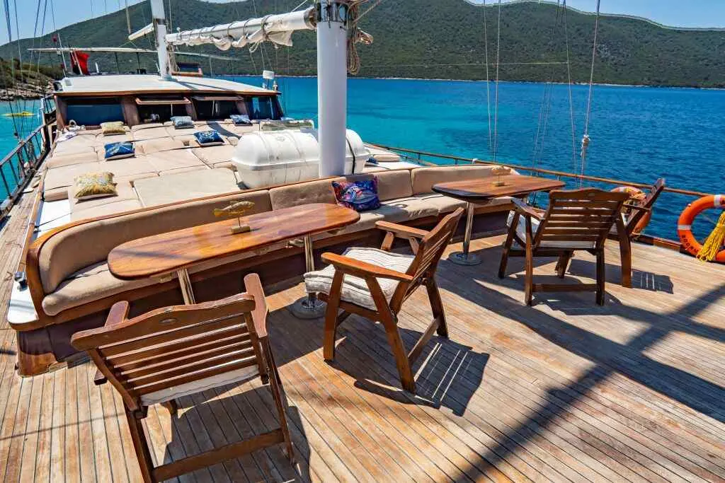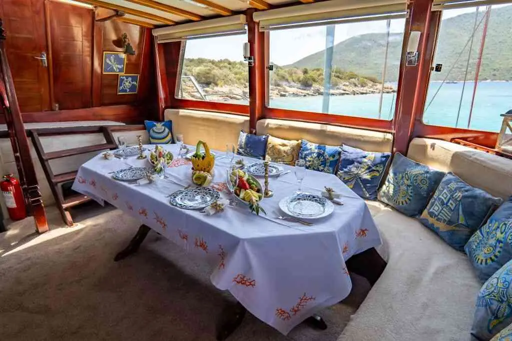 The indoor restaurant serves a range of exquisite dishes prepared by the onboard chef, focusing on Mediterranean cuisine made from fresh, local ingredients, catering to all tastes and dietary requirements. The gulet is also an ideal venue for hosting special events or corporate retreats, with tailored arrangements available to ensure every celebration or meeting is both unique and memorable. Safety is paramount on Gulet Ametist A, equipped with the latest safety and navigational equipment to ensure a secure and comfortable journey for all guests.