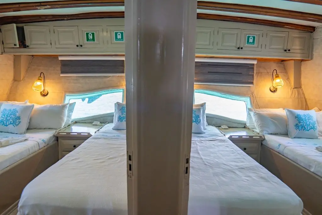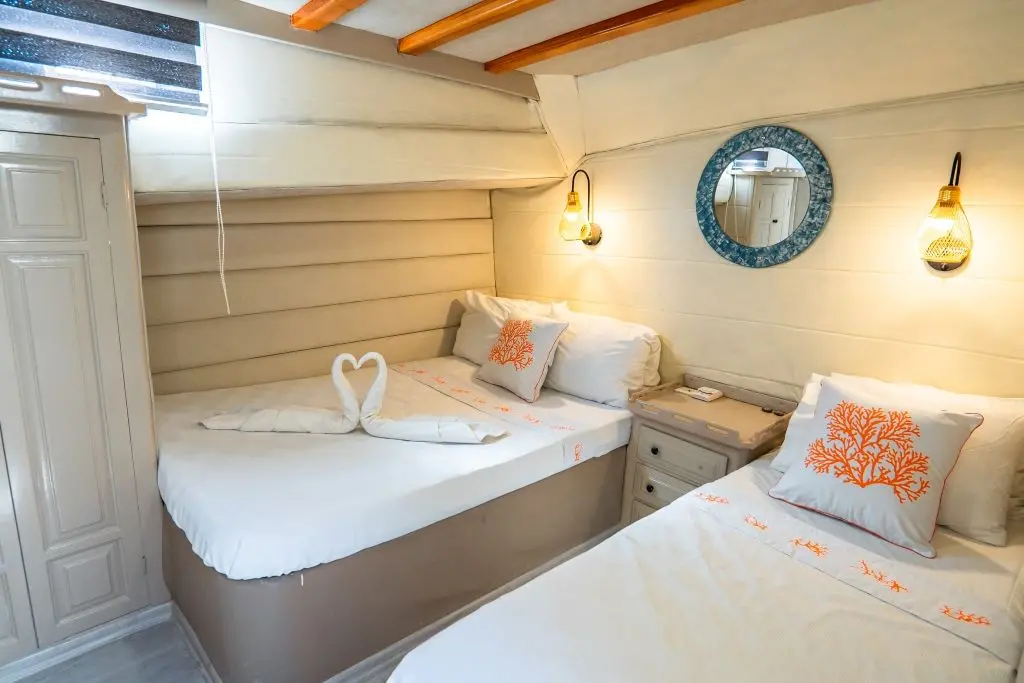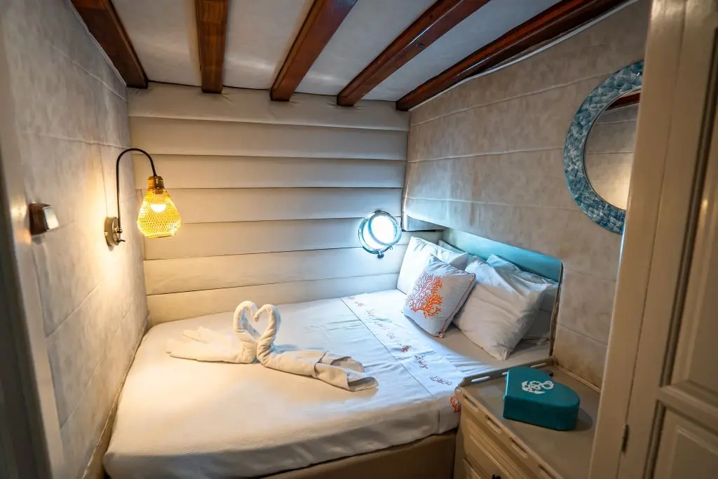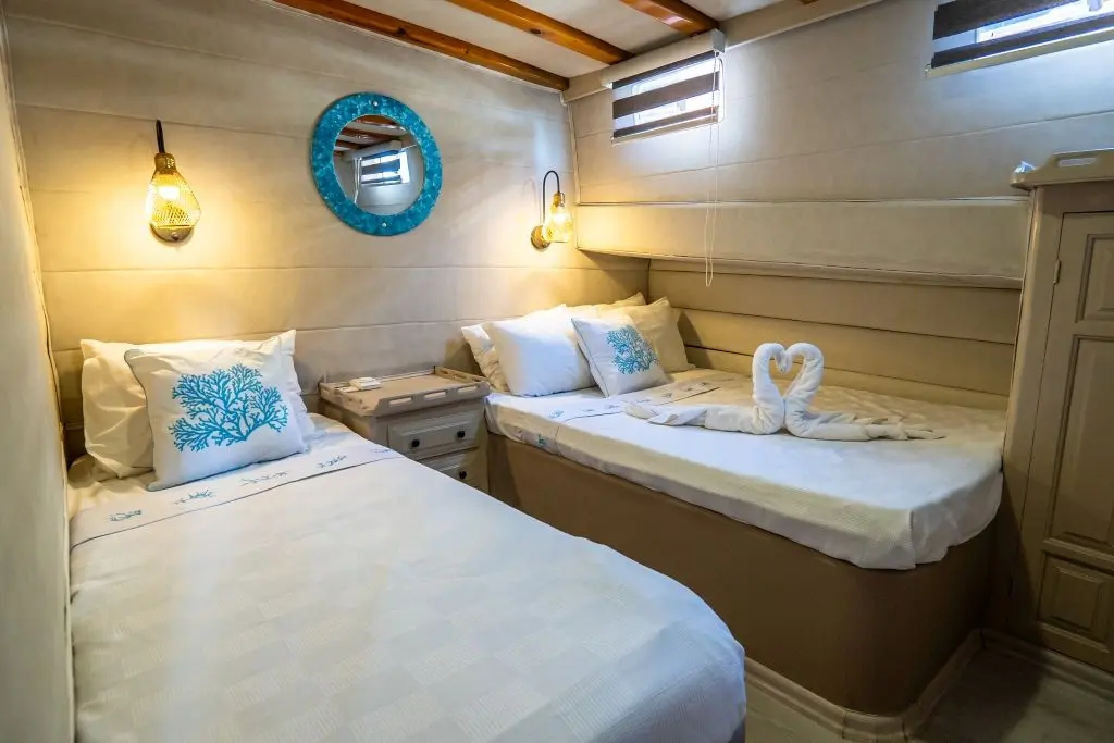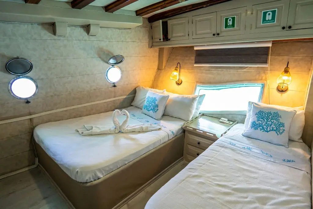 Built in 2000 and refitted in 2017, Gulet Ametist A is designed for both comfort and performance. Powered by a 360 hp Iveco engine and equipped with modern navigation systems, it ensures smooth sailing at a cruising speed of 10 knots. The gulet features 9 comfortable cabins, including 2 Double and 7 Triple, each with air conditioning and en-suite facilities, providing guests with privacy and comfort throughout their journey.