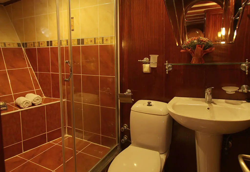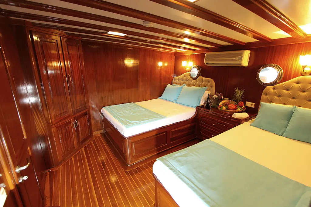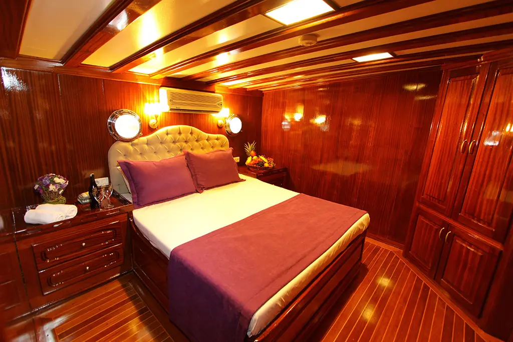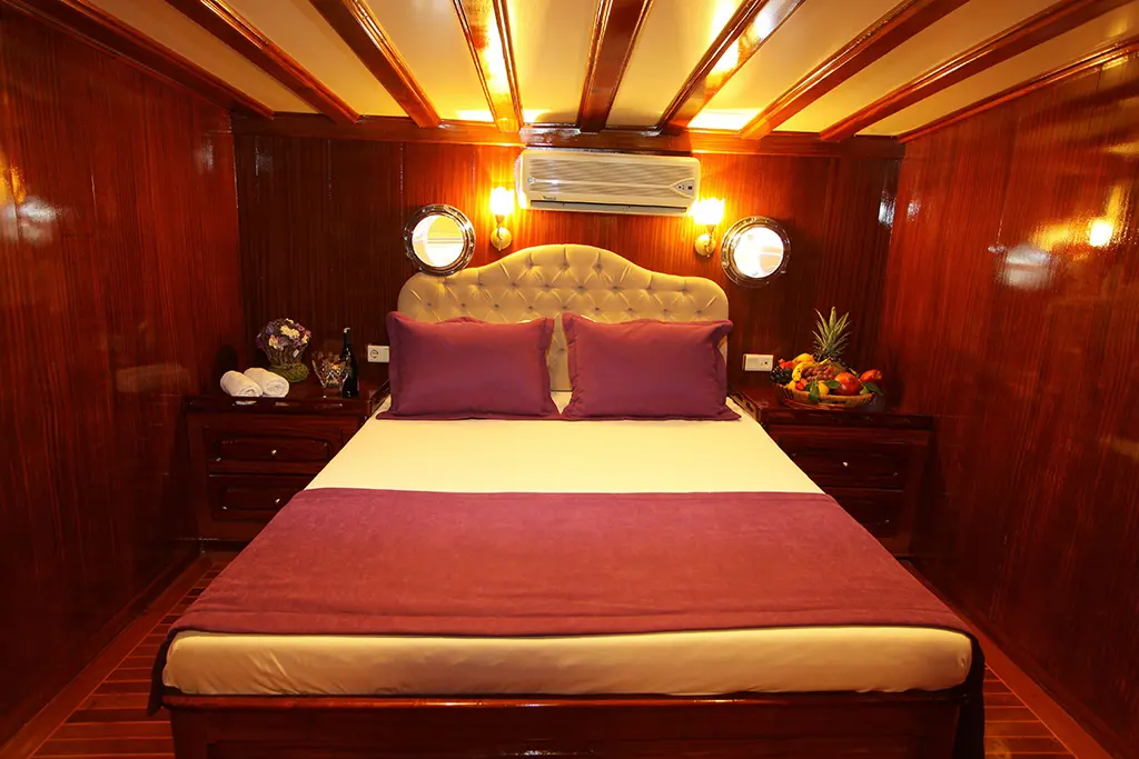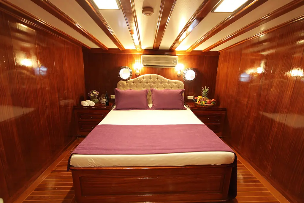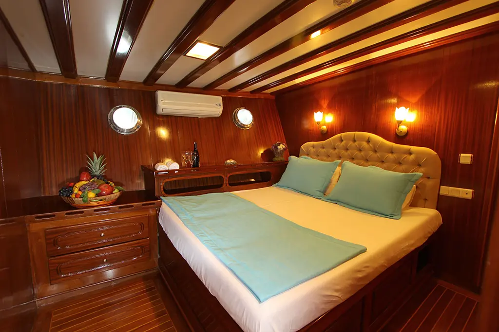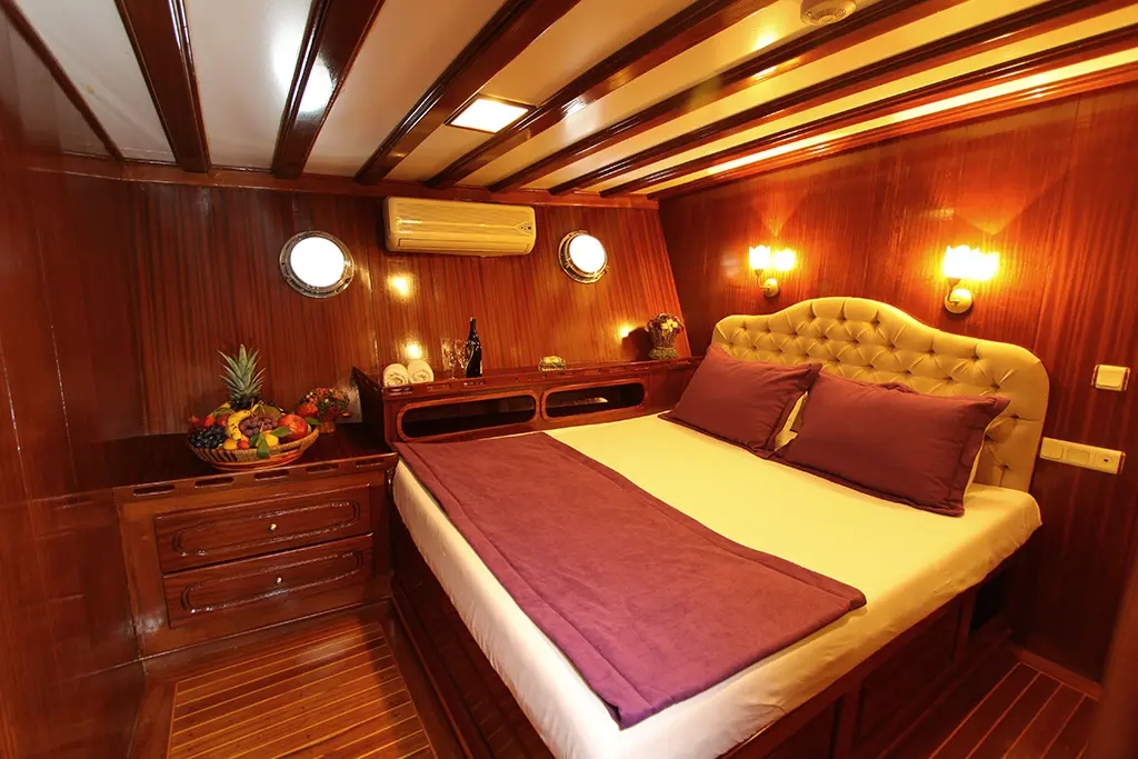 At 39 meters in length with a beam of 8 meters, Gulet Prenses Selin combines spacious elegance with powerful performance, equipped with twin 450 hp Iveco engines and modern navigation systems, ensuring a smooth cruising experience at a comfortable speed of 11 knots. The gulet features 9 well-appointed cabins (7 Double and 2 Triple), each outfitted with air conditioning, private bathrooms, and luxurious furnishings to ensure a comfortable stay for all guests.