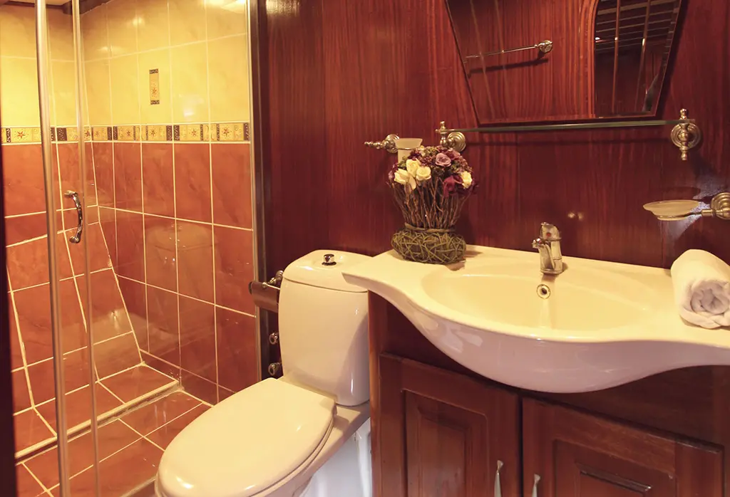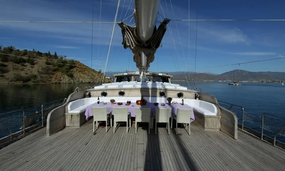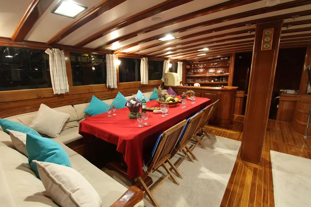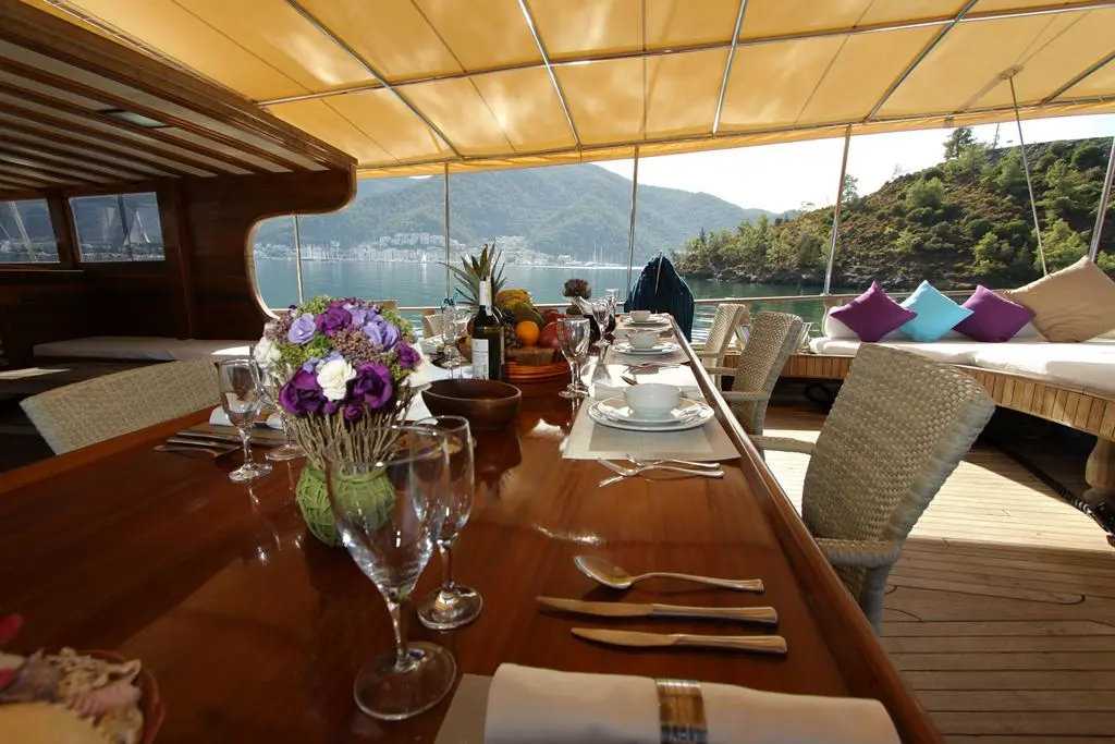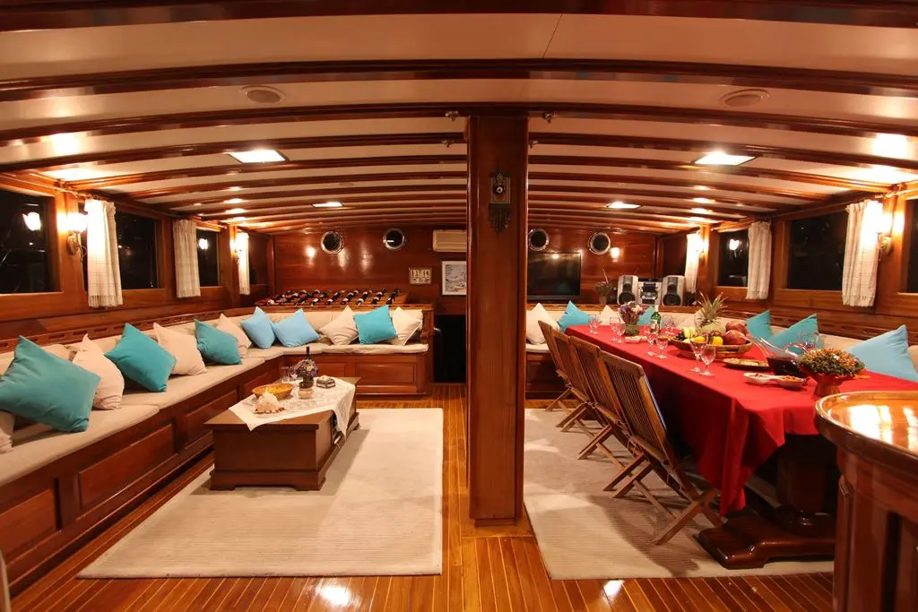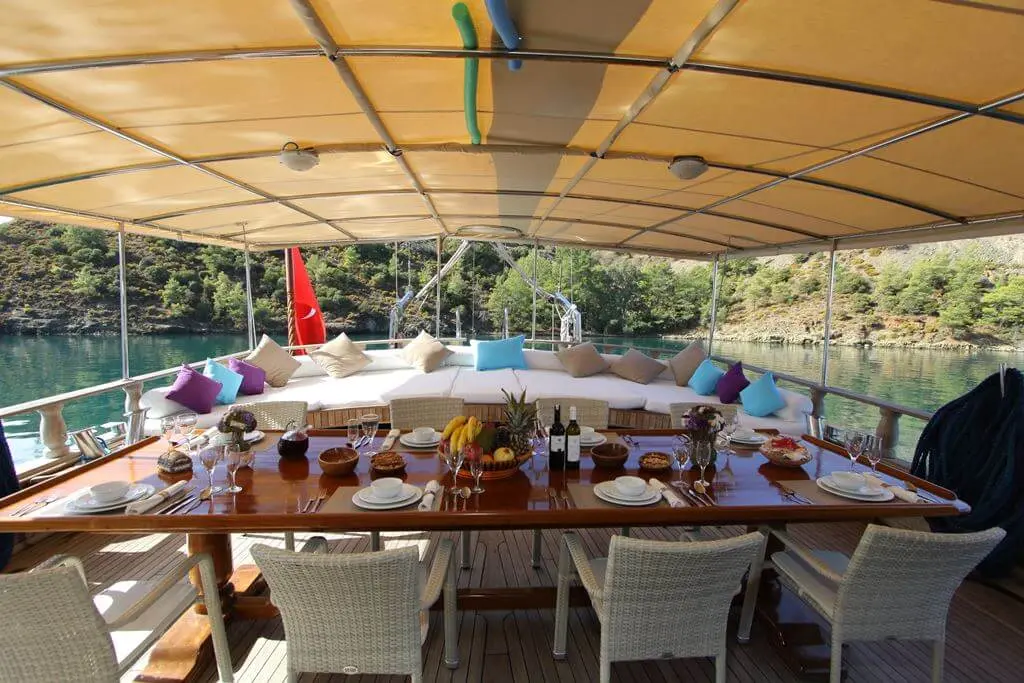 The indoor restaurant offers a delightful dining experience with a menu that highlights local Turkish cuisine, prepared using fresh, locally sourced ingredients, catering to all tastes and dietary requirements. Gulet Prenses Selin sails along the picturesque coastline of Gocek, known for its pristine waters and secluded bays. Customizable itineraries allow guests to explore hidden gems and historical sites, providing a perfect blend of adventure and relaxation.