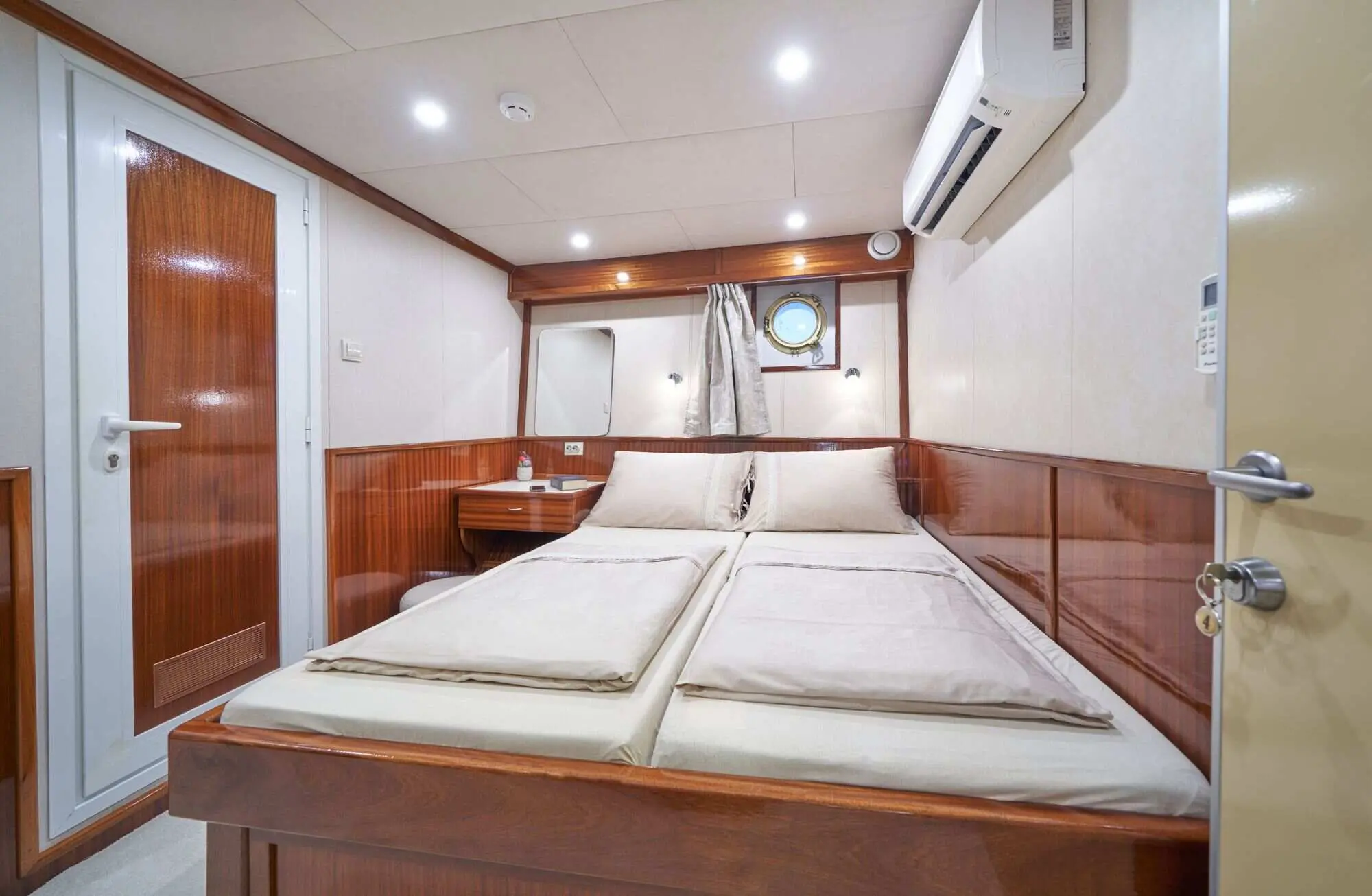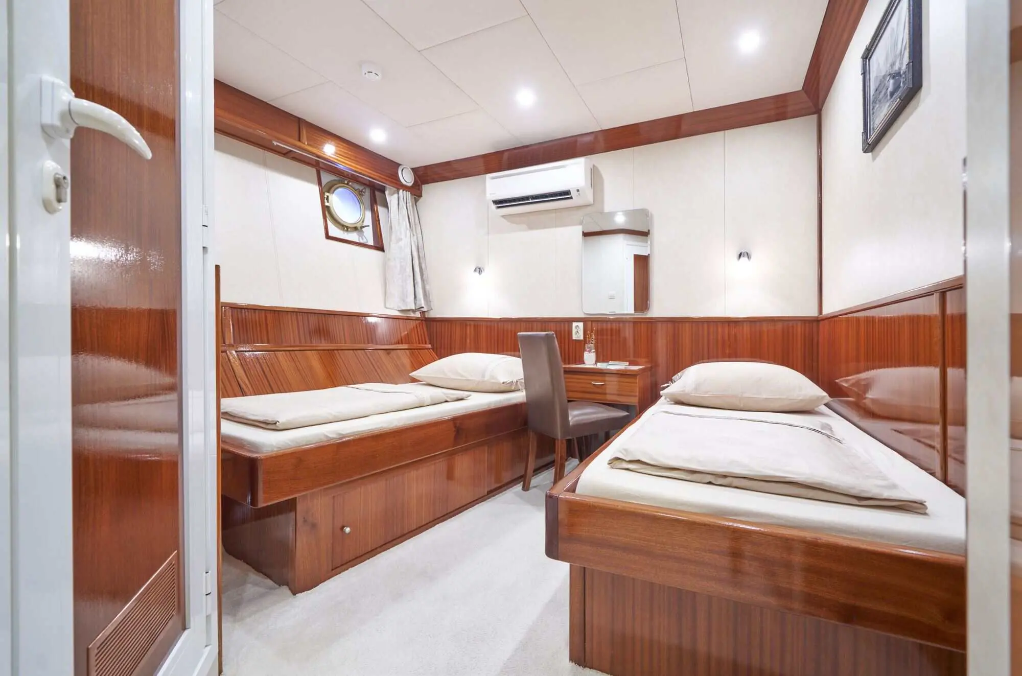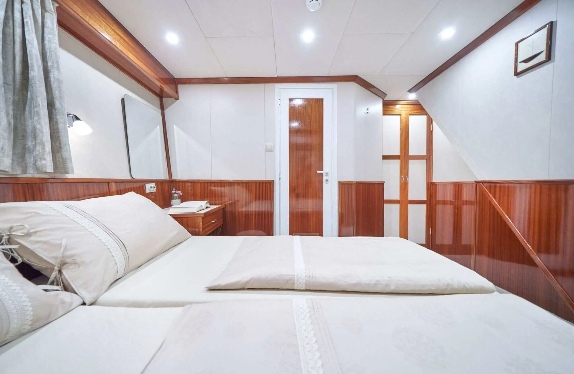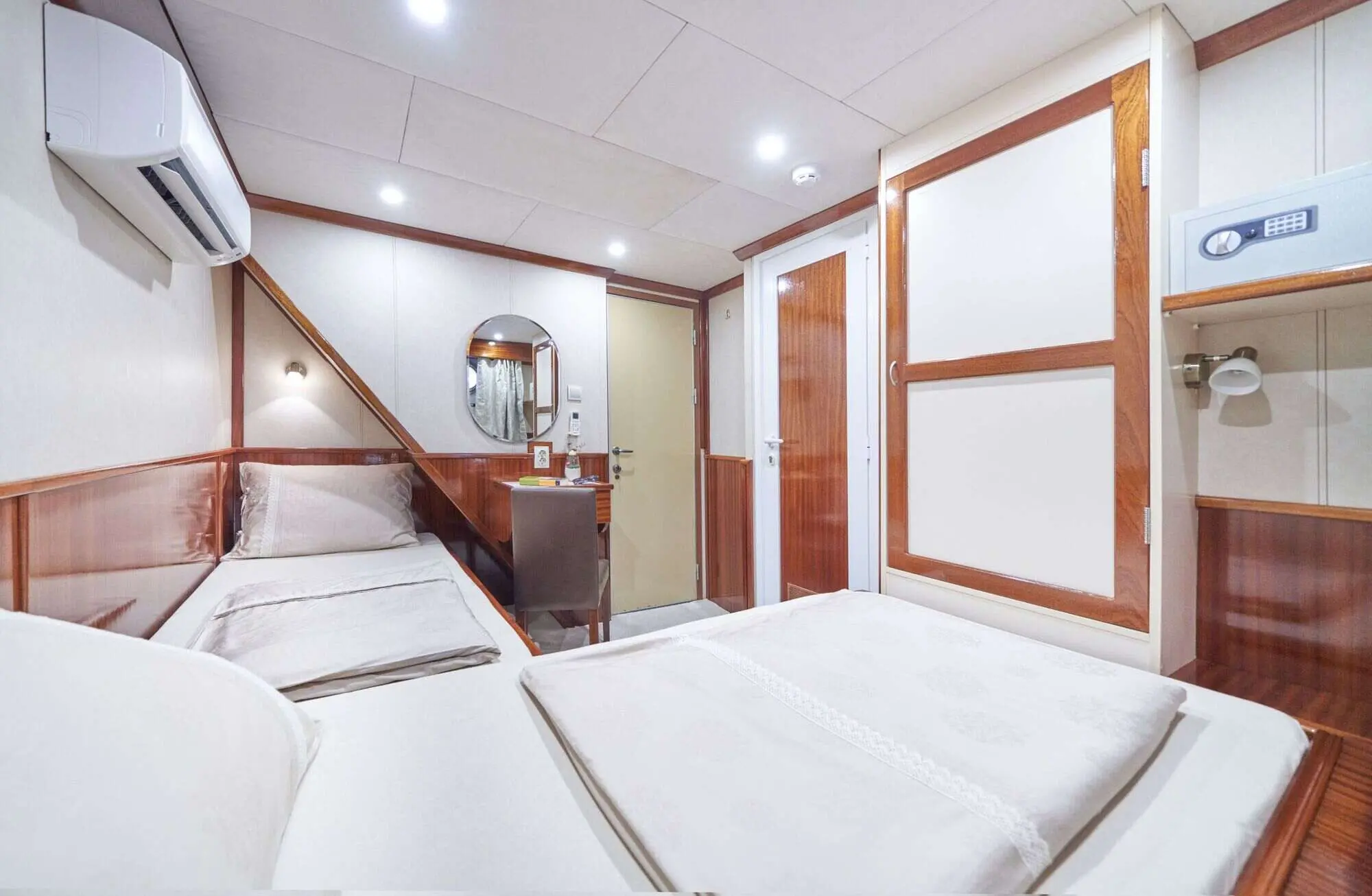 The gulet features a variety of cabin types including 4 Double, 4 Twin, and 1 Convertible cabin, all outfitted with modern amenities such as air conditioning, private bathrooms, and luxurious fittings to ensure guest comfort throughout the voyage. A professional crew of five, skilled in maritime and hospitality services, is dedicated to providing guests with a high level of care and attention. Their expertise ensures every aspect of the journey is managed seamlessly from start to finish.
