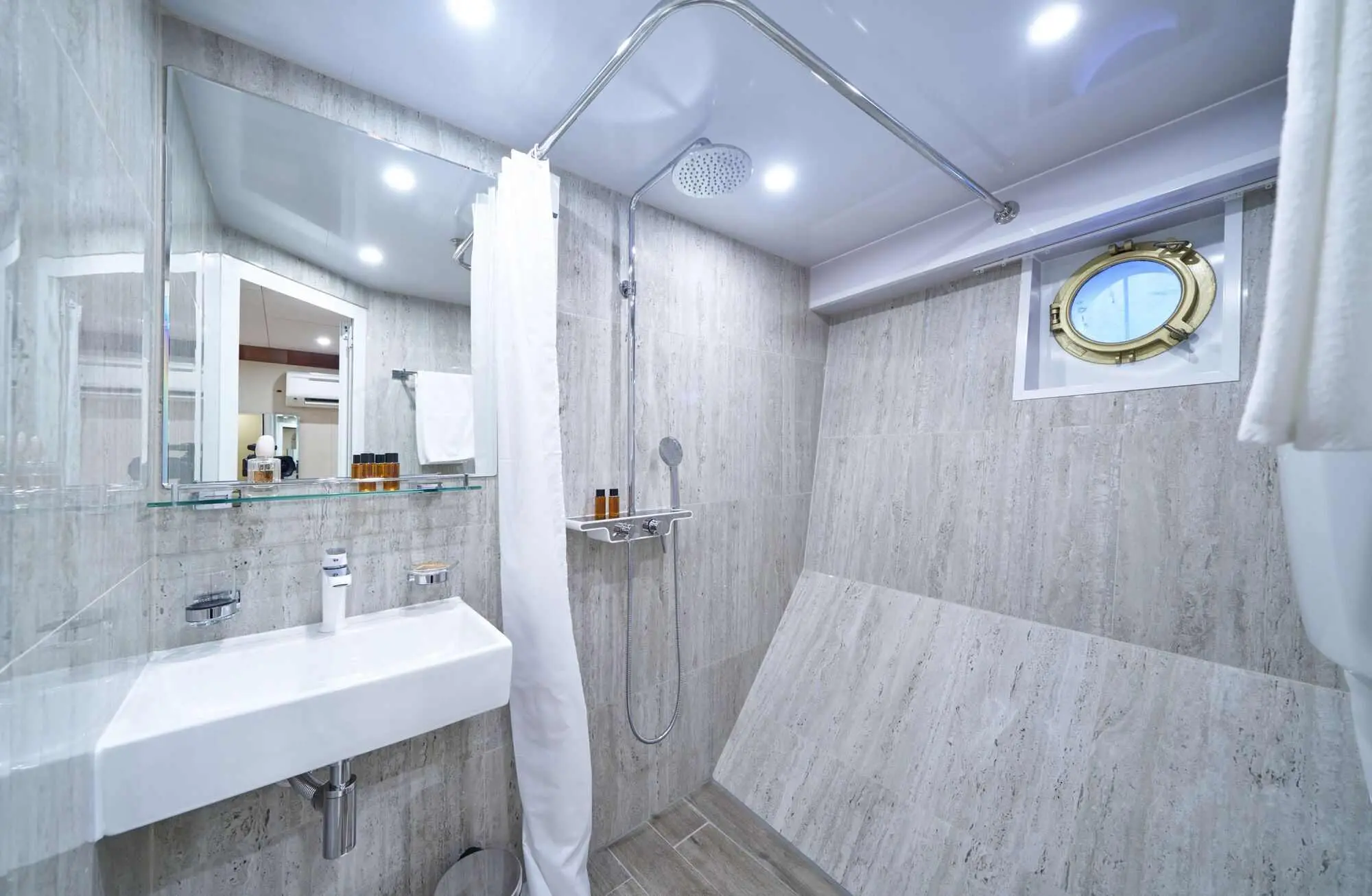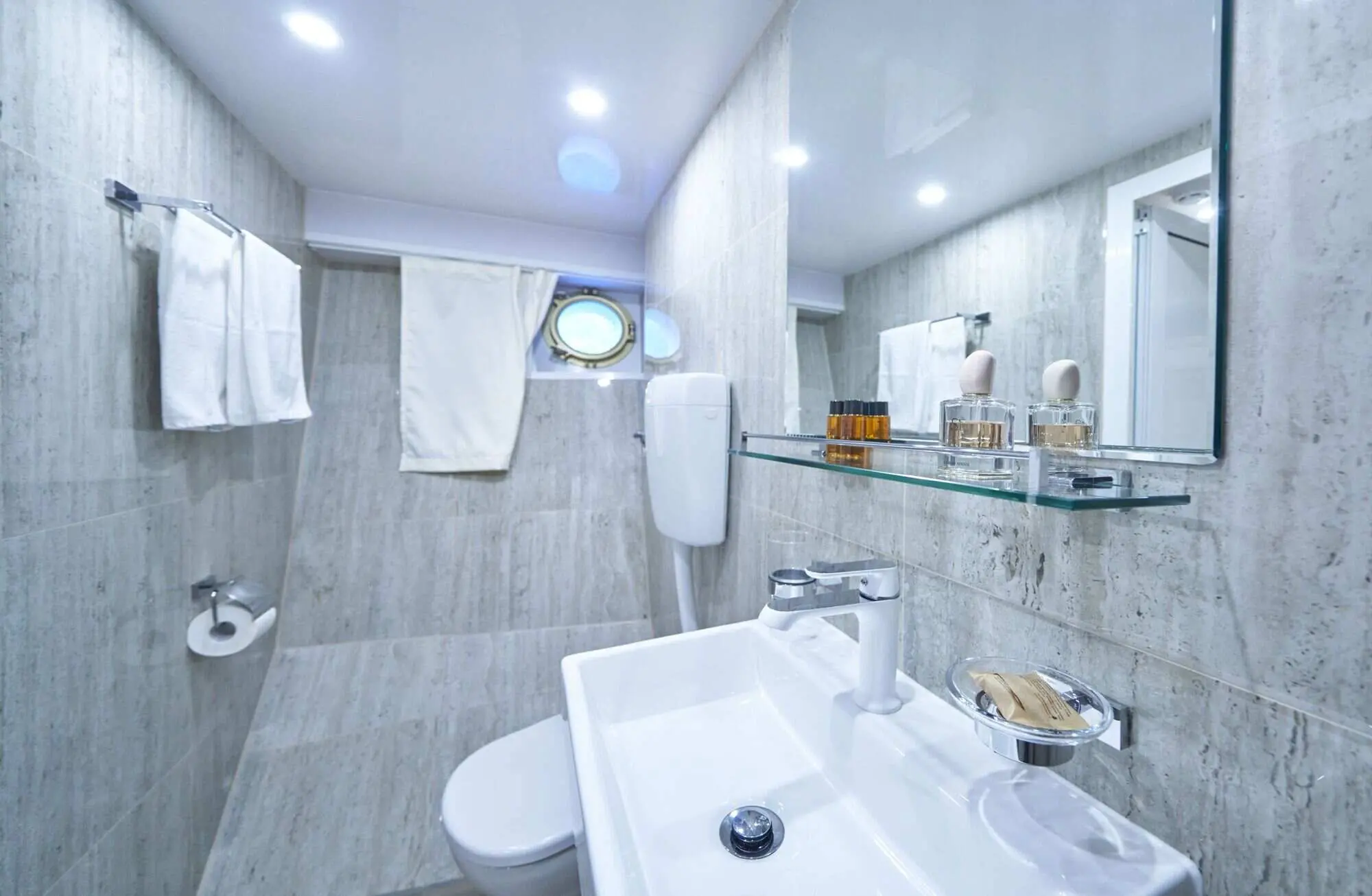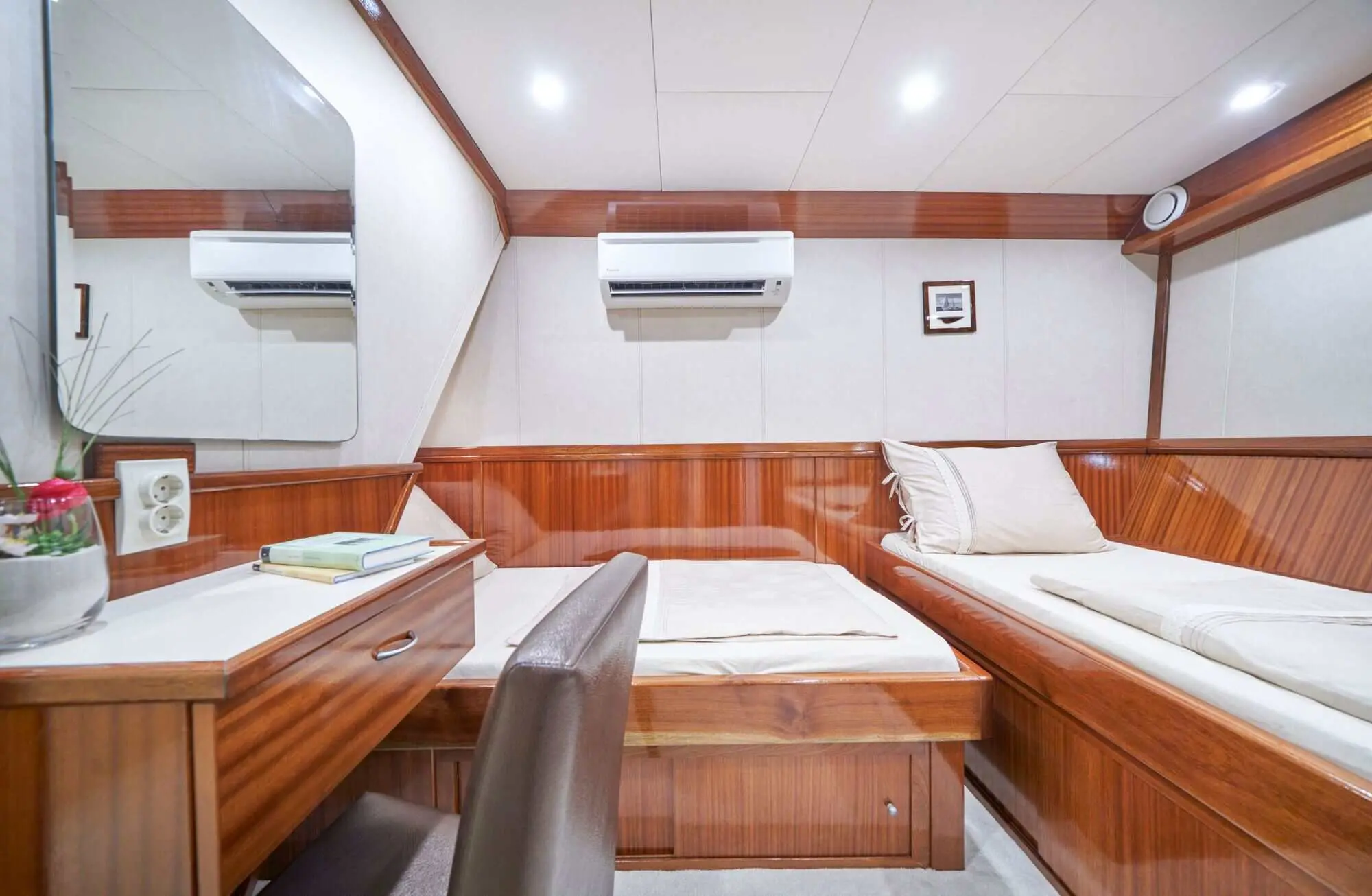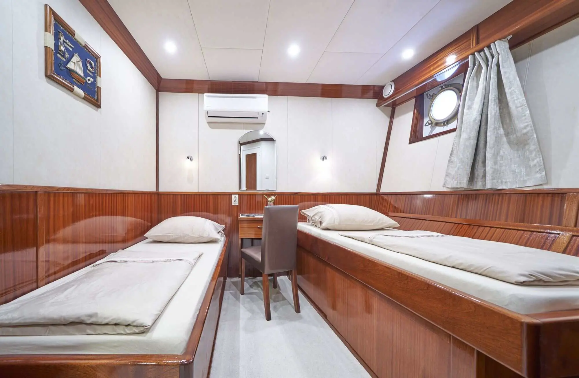 The gulet features a variety of cabin types including 4 Double, 4 Twin, and 1 Convertible cabin, all outfitted with modern amenities such as air conditioning, private bathrooms, and luxurious fittings to ensure guest comfort throughout the voyage. A professional crew of five, skilled in maritime and hospitality services, is dedicated to providing guests with a high level of care and attention. Their expertise ensures every aspect of the journey is managed seamlessly from start to finish.